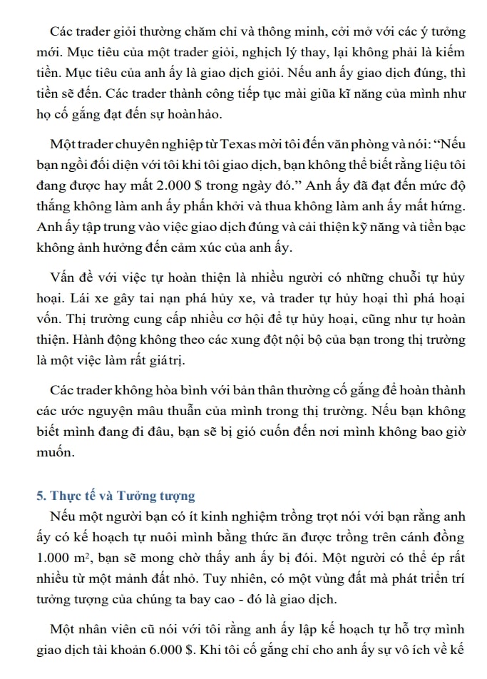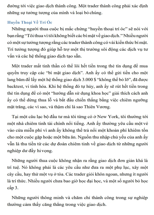 Elder dành nhiều chương để phân tích những cảm xúc có thể phá nát tài khoản nếu trader không học cách kiểm soát. Ham muốn gỡ lỗ sau một chuỗi thua, giao dịch quá mức khi thị trường biến động, không dám cắt lỗ đúng lúc, hay ám ảnh với việc phải thắng liên tục… là những sai lầm mà hầu hết ai cũng từng mắc phải. Người đọc khi đi qua từng trang sách như đang soi lại chính mình trong gương, nhận ra những lỗi lầm tưởng như nhỏ nhưng lại mang sức ảnh hưởng rất lớn đến kết quả giao dịch.
