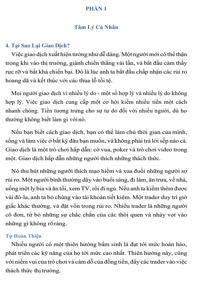 uốn sách giải thích vì sao tâm lý lại là chiếc chìa khóa mở cửa thành công, và cách người giao dịch có thể xây dựng một tinh thần vững vàng để không bị thị trường dắt mũi. Elder bóc tách từng lớp của cảm xúc như sợ hãi, tham lam, tự tin thái quá, rồi chỉ ra cách để biến chúng thành lợi thế thay vì thói quen phá hoại tài khoản.