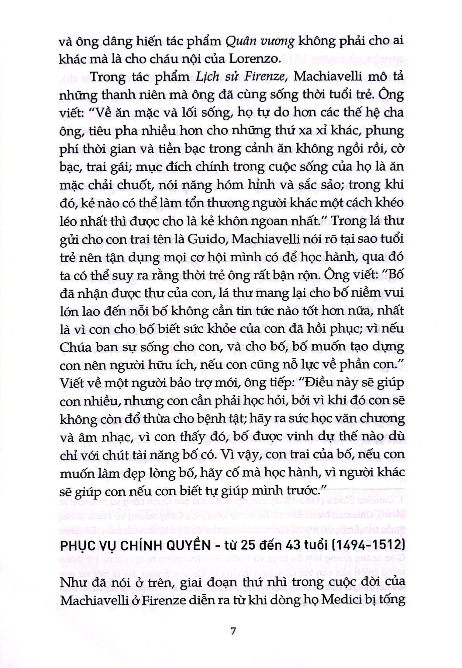Quân Vương là một tác phẩm xứng đáng để đọc và nghiền ngẫm, bởi nó mang đến những bài học vượt thời gian mà ngay cả thế giới hiện đại vẫn còn áp dụng. Những triết lý sắc bén của Machiavelli không chỉ hướng tới tầng lớp lãnh đạo, mà còn khơi gợi ở mỗi độc giả sự thông thái, khả năng nhìn nhận bản chất sự việc và nâng cao trí tuệ ứng xử. Đọc cuốn sách, bạn sẽ thấy chính trị không còn xa lạ, mà trái lại, có liên hệ mật thiết với đời sống hàng ngày.