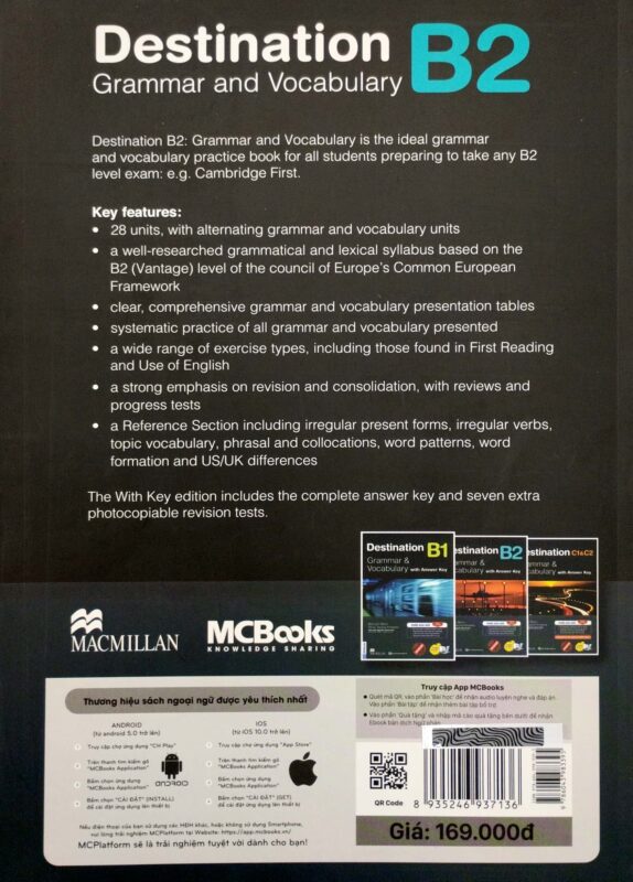 Không chỉ dừng lại ở nội dung chính, Destination B2 phiên bản phát hành bởi MCBooks tại Việt Nam còn bổ sung nhiều tài nguyên hữu ích như: danh mục từ vựng kèm phiên âm và nghĩa tiếng Việt, ebook dịch ngữ pháp chi tiết, audio luyện nghe, và hơn 500 bài tập ngữ pháp trên ứng dụng MCBooks App. Nhờ vậy, người học có thể tự học, tự luyện và nâng cao trình độ một cách hiệu quả, có định hướng rõ ràng cho hành trình chinh phục chứng chỉ tiếng Anh B2 và cao hơn.