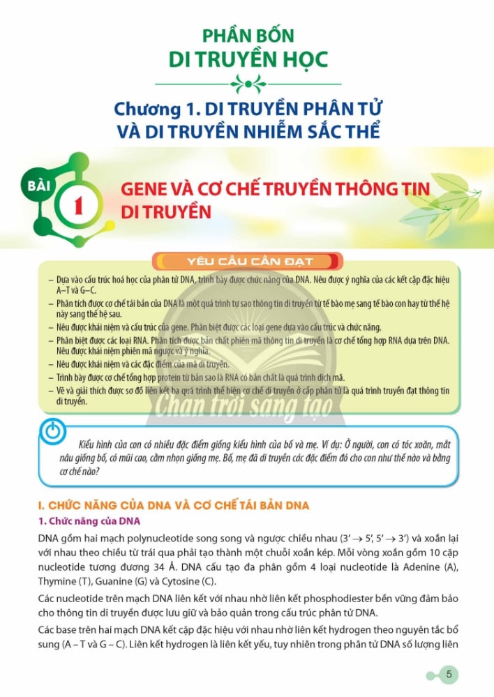 Bài 1 mở đầu cho hành trình khám phá lớp 12 là phần “Cơ chế di truyền và biến dị”, giúp học sinh hiểu sâu về gen, ADN, NST và các quy luật di truyền của Mendel. Đây là nền tảng để học tốt các bài tiếp theo và nắm vững bản chất của sự sống. Nội dung bài 1 được biên soạn theo hướng gợi mở, có phần thực hành quan sát mô hình ADN, giúp học sinh không chỉ hiểu mà còn hình dung được quá trình di truyền đang diễn ra trong từng tế bào.