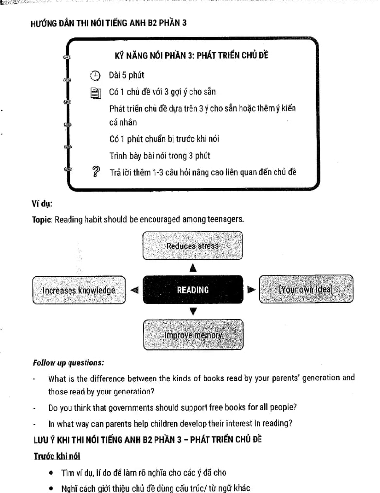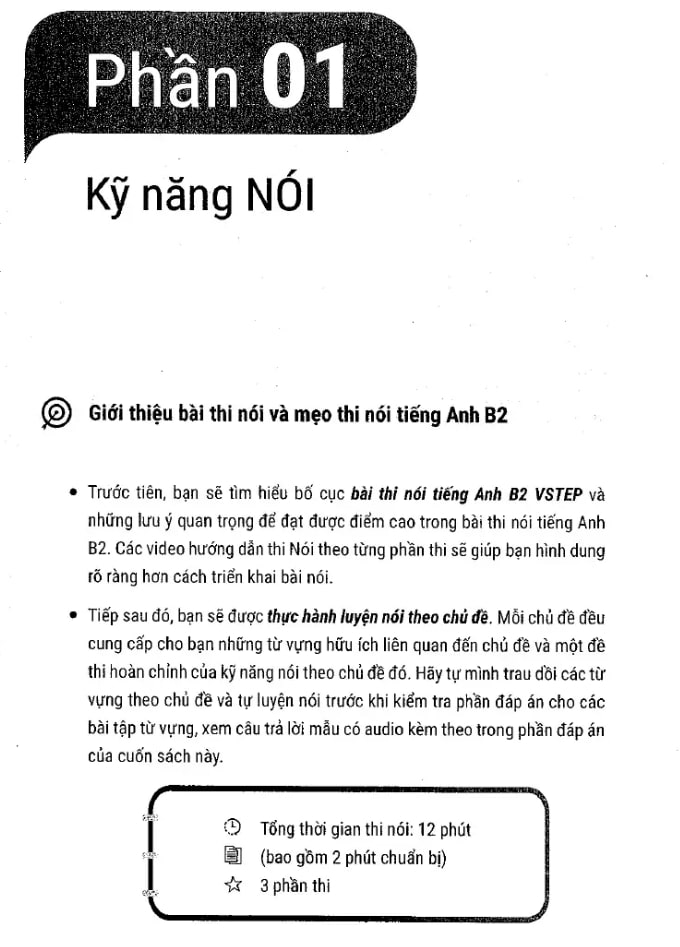 Phần nói hướng dẫn học viên cách phát triển ý tưởng, trình bày logic, sử dụng từ vựng phong phú và ngữ pháp chuẩn. Các bài luyện tập đi từ: