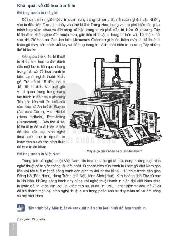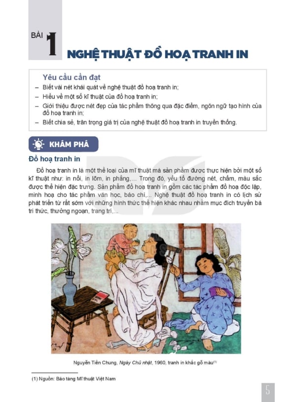 Khái niệm đồ họa và tranh in: Học sinh được làm quen với khái niệm đồ họa, các thể loại tranh in (bản dập, in gỗ, in lụa…) và vai trò của chúng trong nghệ thuật và đời sống.