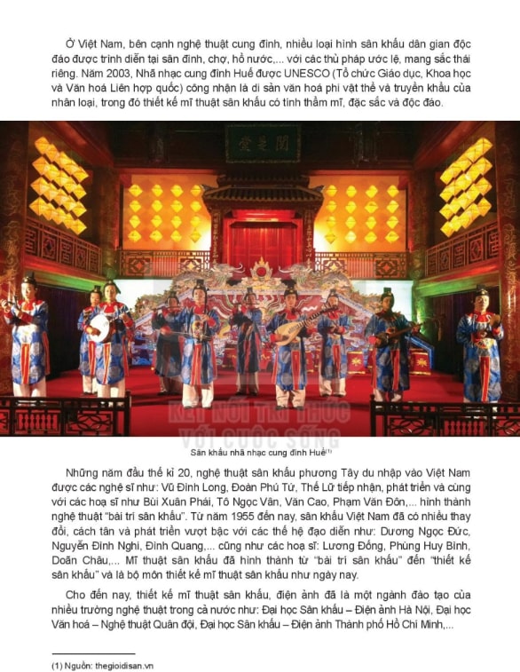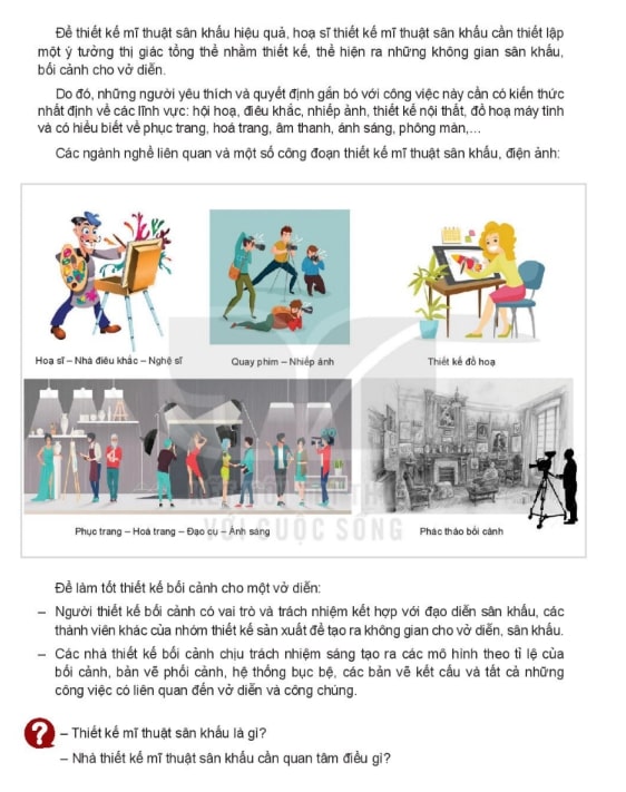 Người đọc được làm quen với quy trình sáng tạo: từ khi đạo diễn hình thành ý tưởng, biên kịch viết kịch bản, cho đến lúc đội ngũ thiết kế không gian – ánh sáng – phục trang bắt tay vào xây dựng một thế giới nghệ thuật hoàn chỉnh. Thông qua phần này, học sinh dần hiểu vì sao thiết kế mỹ thuật sân khấu – điện ảnh được coi là “linh hồn hình ảnh” của một tác phẩm.