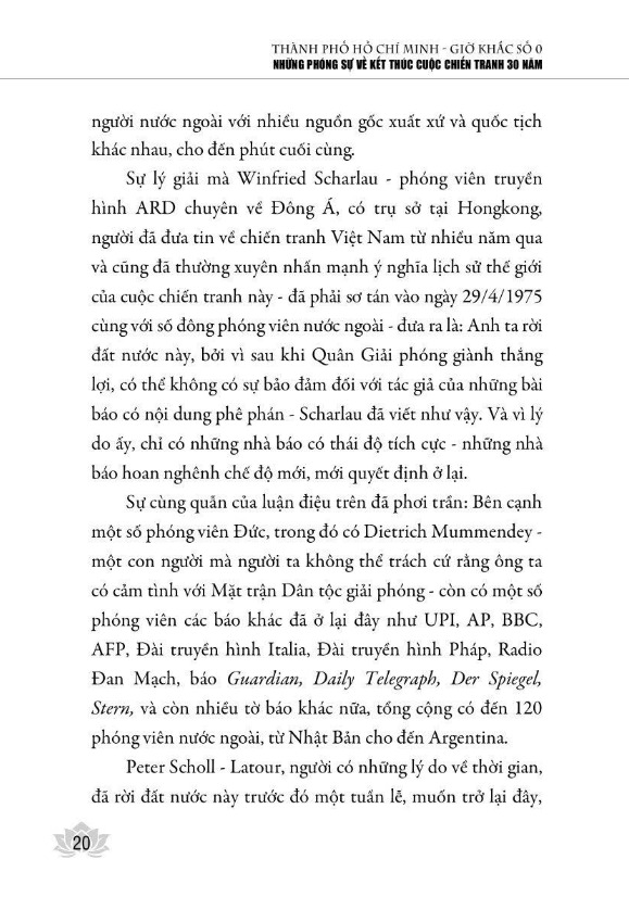 “Thành Phố Hồ Chí Minh – Giờ Khắc Số 0 – Những Phóng Sự Về Kết Thúc Cuộc Chiến Tranh 30 Năm” của nhà báo Börries Gallasch là một tác phẩm nổi bật phản ánh chân thực khoảnh khắc lịch sử quan trọng bậc nhất trong thế kỷ XX của Việt Nam. Cuốn sách tập hợp những phóng sự trực tiếp của các nhà báo phương Tây – những nhân chứng có mặt tại Sài Gòn trong những ngày tháng Tư năm 1975, khi cuộc chiến tranh kéo dài ba thập kỷ khép lại.
