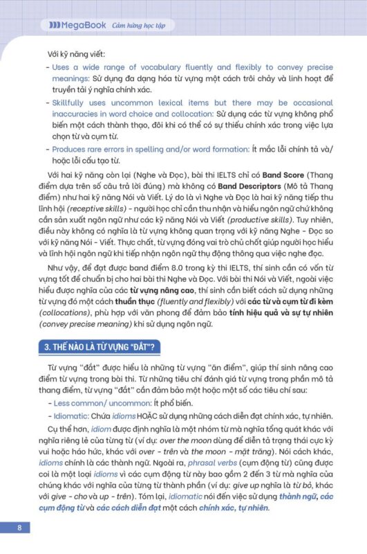 Band 8.0 IELTS phản ánh khả năng sử dụng tiếng Anh gần mức thành thạo học thuật, nơi từng lựa chọn từ ngữ đều ảnh hưởng trực tiếp đến điểm số. Vì vậy, việc đầu tư vào sách từ vựng ielts 8.0, bao gồm từ vựng ielts 8.0 lê thu hà pdf, tài liệu từ vựng đắt và các bộ nâng cấp từ vựng ielts pdf, là bước đi mang tính chiến lược.