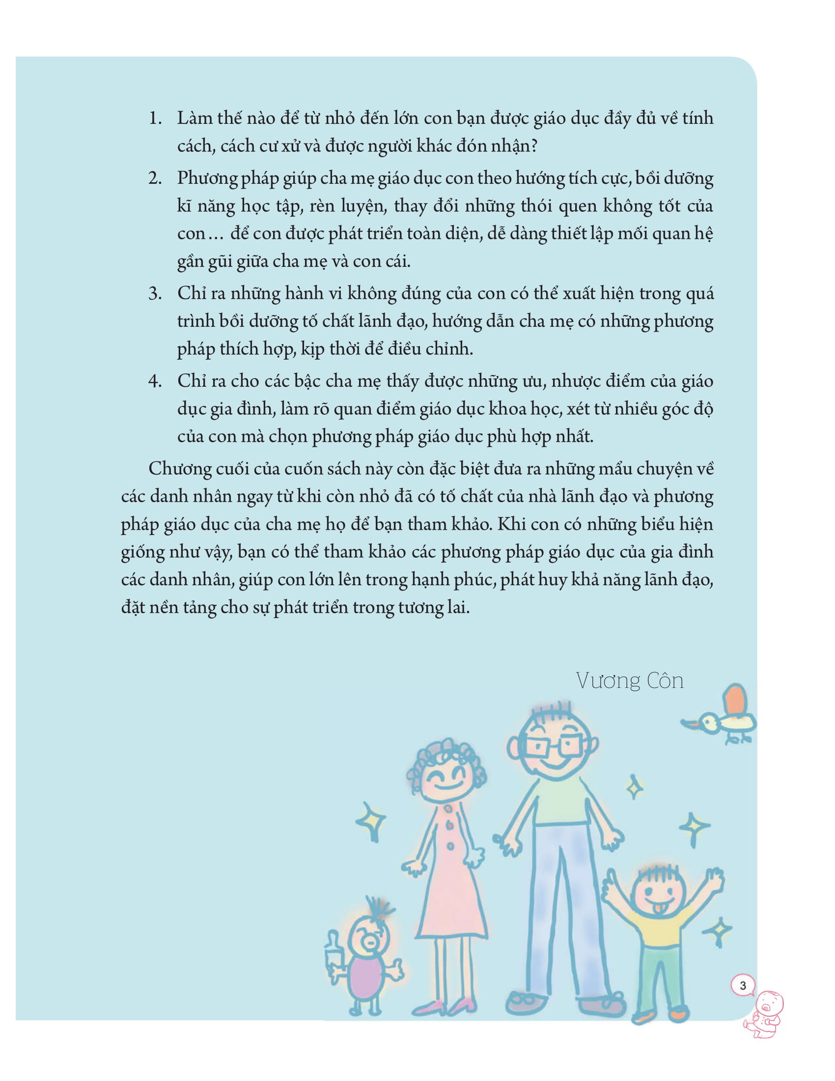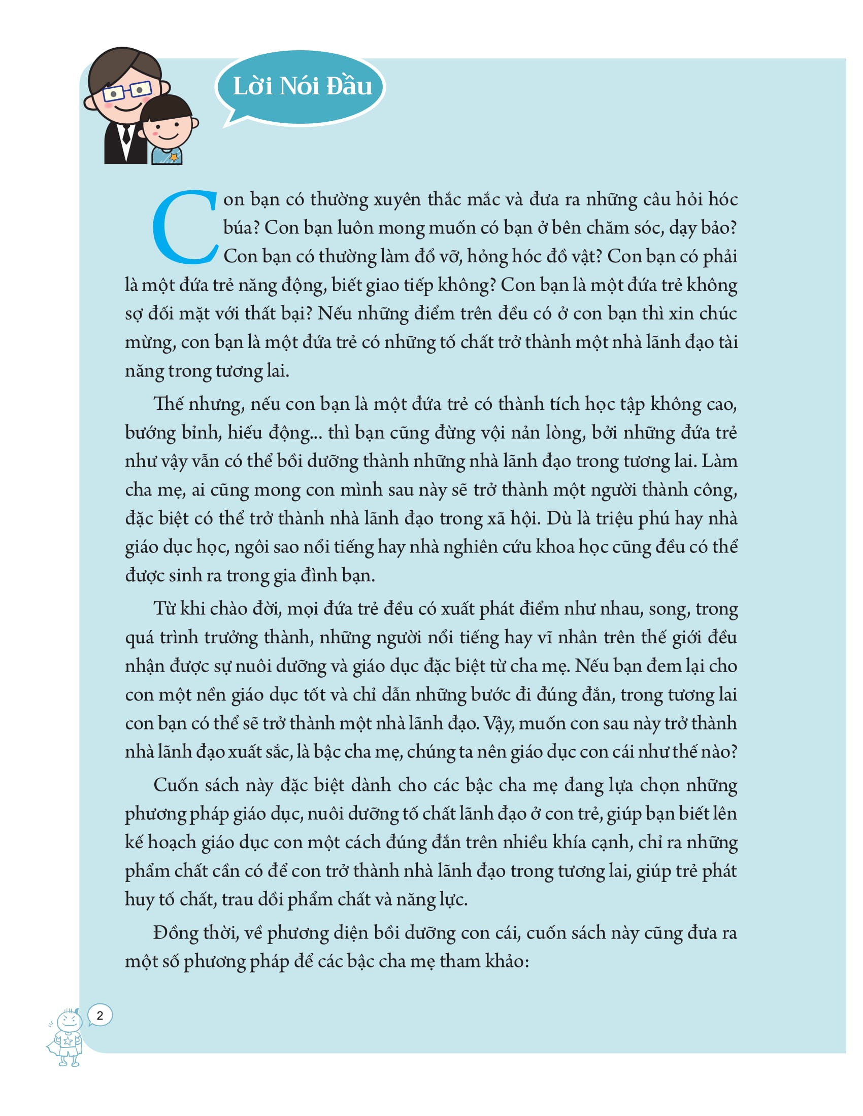 Dạy Con Phẩm Chất Của Nhà Lãnh Đạo Ưu Tú là cuốn sách truyền cảm hứng dành cho các bậc cha mẹ mong muốn nuôi dạy con trở thành những người tự tin, có tầm nhìn và năng lực lãnh đạo. Thông qua những bài học thực tế và ví dụ sinh động, sách giúp cha mẹ hiểu rõ cách khơi dậy tiềm năng lãnh đạo trong con từ sớm – không phải bằng sự áp đặt, mà bằng định hướng và khích lệ đúng cách.