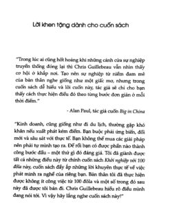 Với hàng chục câu chuyện truyền cảm hứng từ những người bình thường – giáo viên, nhân viên văn phòng, thậm chí là sinh viên – đã tạo dựng doanh nghiệp từ số vốn ít ỏi, Chris chứng minh rằng: ý tưởng và sự kiên trì quan trọng hơn tiền bạc. Cuốn sách giúp bạn khám phá cách xác định thế mạnh cá nhân, tìm ra sản phẩm/dịch vụ có giá trị, xây dựng khách hàng đầu tiên và mở rộng quy mô bền vững.