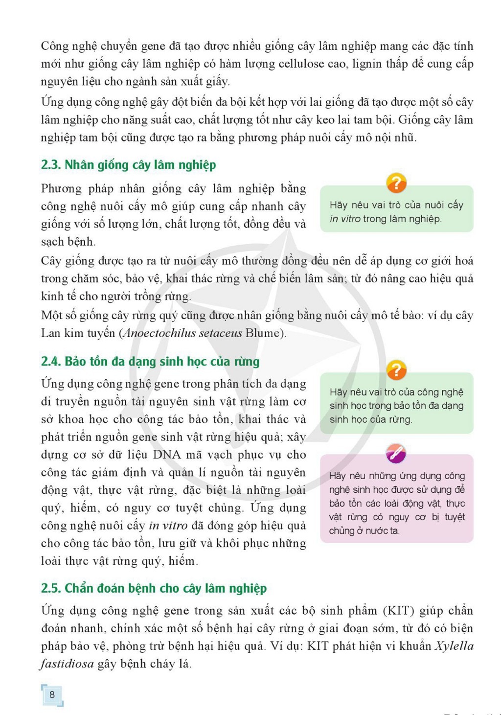 SGK Công Nghệ 12 Lâm Nghiệp – Thủy Sản được trình bày theo hình thức học tích hợp, kết hợp giữa lý thuyết, hoạt động thực hành, và bài tập vận dụng. Mỗi chương đều có: