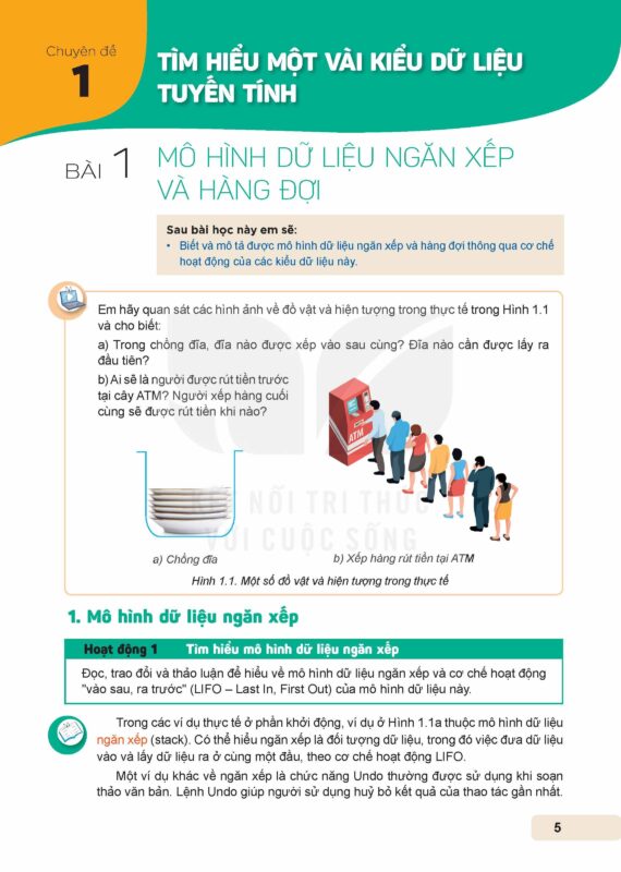 Phần này giúp học sinh tìm hiểu sâu hơn về mảng, danh sách liên kết, ngăn xếp, hàng đợi, cây – những cấu trúc dữ liệu cơ bản trong lập trình. Kiến thức được trình bày logic, dễ hiểu, kèm theo ví dụ minh họa và bài tập ứng dụng thực tế.