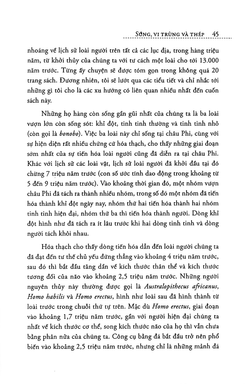 Cuốn sách “Súng, Vi Trùng Và Thép: Định mệnh của các xã hội loài người” của Jared Diamond là một trong những tác phẩm khoa học phổ thông nổi tiếng nhất thế giới, từng được dịch ra hơn 33 ngôn ngữ và nhận nhiều giải thưởng uy tín. Với lối phân tích logic cùng những dẫn chứng thuyết phục, tác giả đã bác bỏ quan điểm cho rằng sự thống trị của một nền văn minh dựa trên trí tuệ, đạo đức hay yếu tố di truyền.