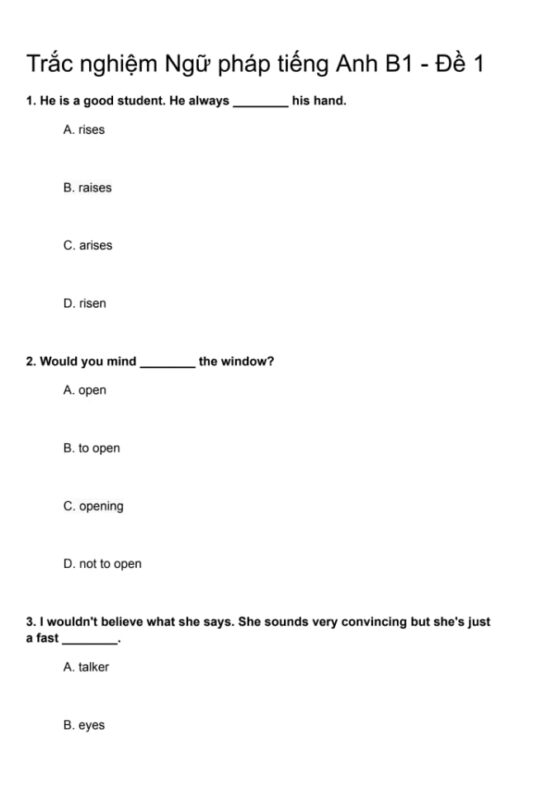 Bộ tài liệu ôn thi B1 dưới đây được tổng hợp từ nhiều nguồn uy tín như Cambridge, Vstep và các trường đại học quốc gia, phù hợp cho mọi đối tượng thi chứng chỉ.