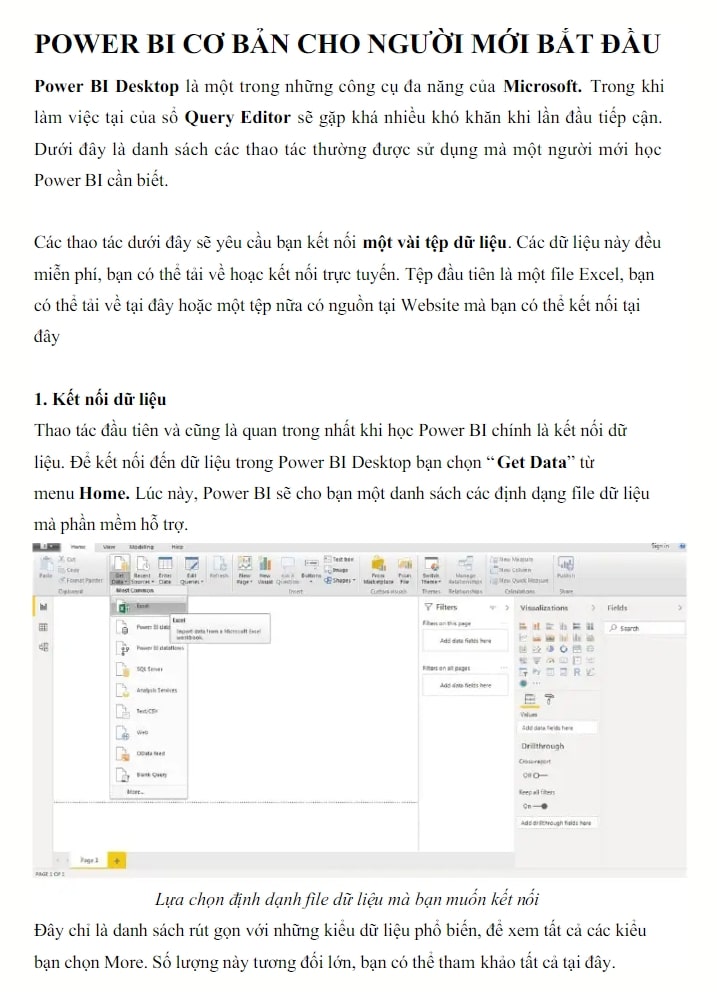Đây là dạng tài liệu được chia sẻ rộng rãi và dễ tiếp cận nhất. Bộ tài liệu này bao gồm hướng dẫn cài đặt Power BI Desktop, làm quen giao diện, kết nối dữ liệu từ Excel, SQL Server, Web hoặc Google Sheets. Ngoài ra còn có phần hướng dẫn tạo biểu đồ, tối ưu mô hình dữ liệu và xuất báo cáo.