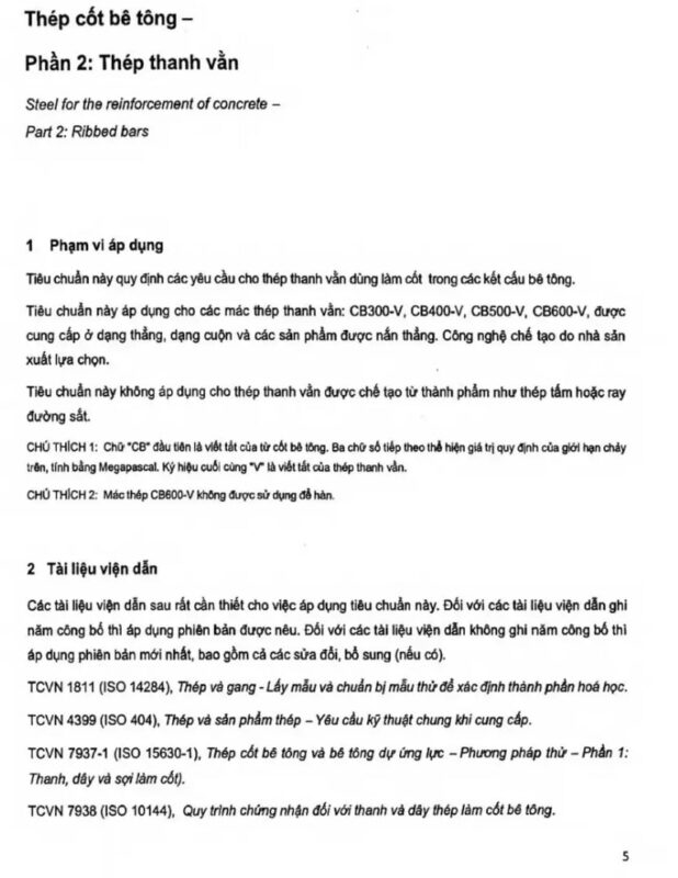 TCVN 1651-2:2018 quy định yêu cầu kỹ thuật đối với thép thanh vằn, dùng làm cốt trong bê tông cho các công trình xây dựng dân dụng và công nghiệp. Tiêu chuẩn này bao gồm các mác thép phổ biến như CB300-V, CB400-V, CB500-V và CB600-V, được sản xuất ở dạng thanh thẳng hoặc cuộn.
