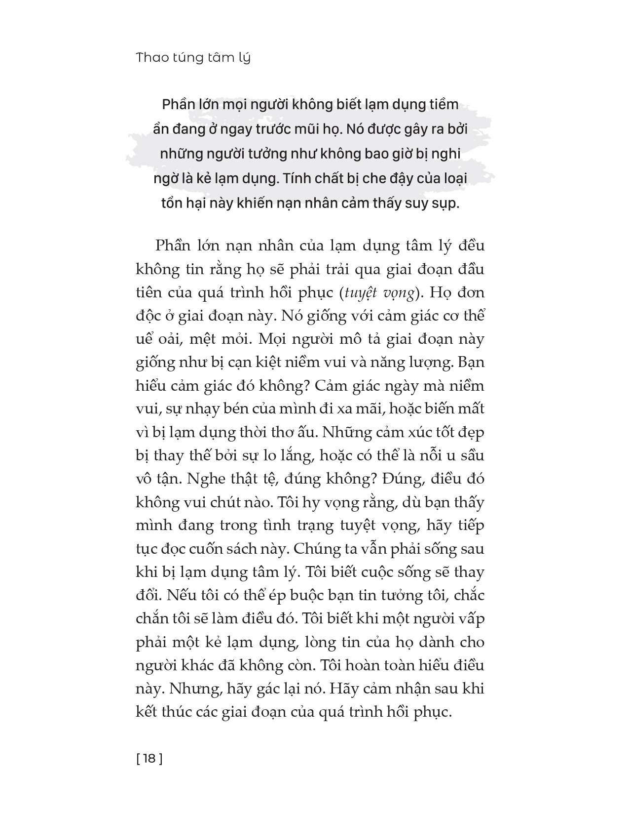 Ngoài việc phân tích chi tiết các biểu hiện của thao túng tâm lý, Thao Túng Tâm Lý hướng dẫn người đọc bước vào hành trình chữa lành gồm 6 giai đoạn cụ thể: