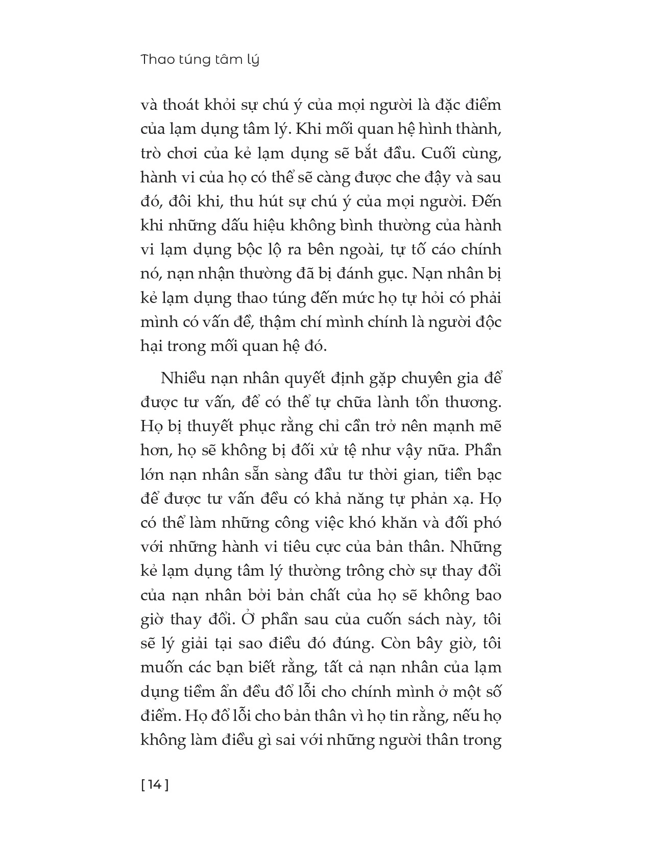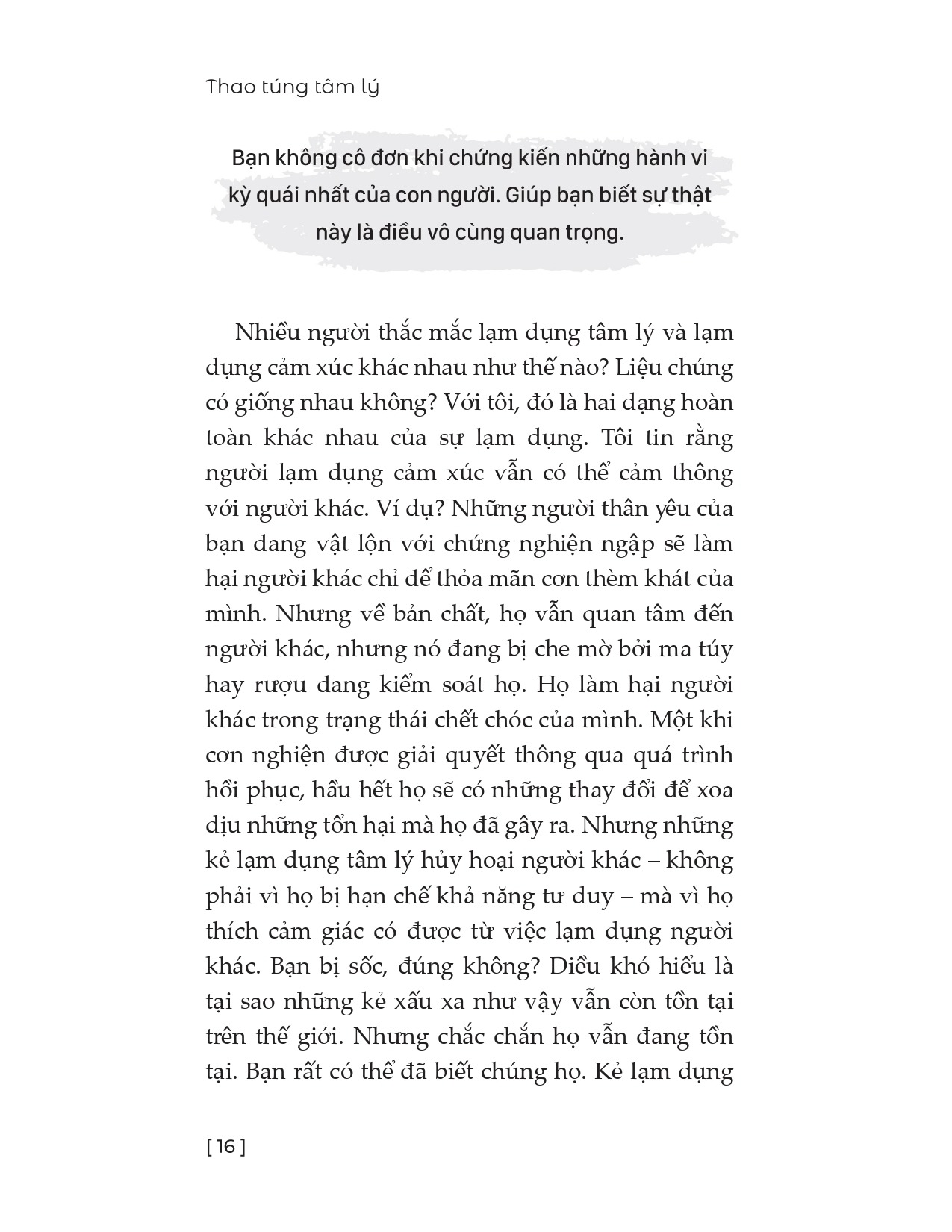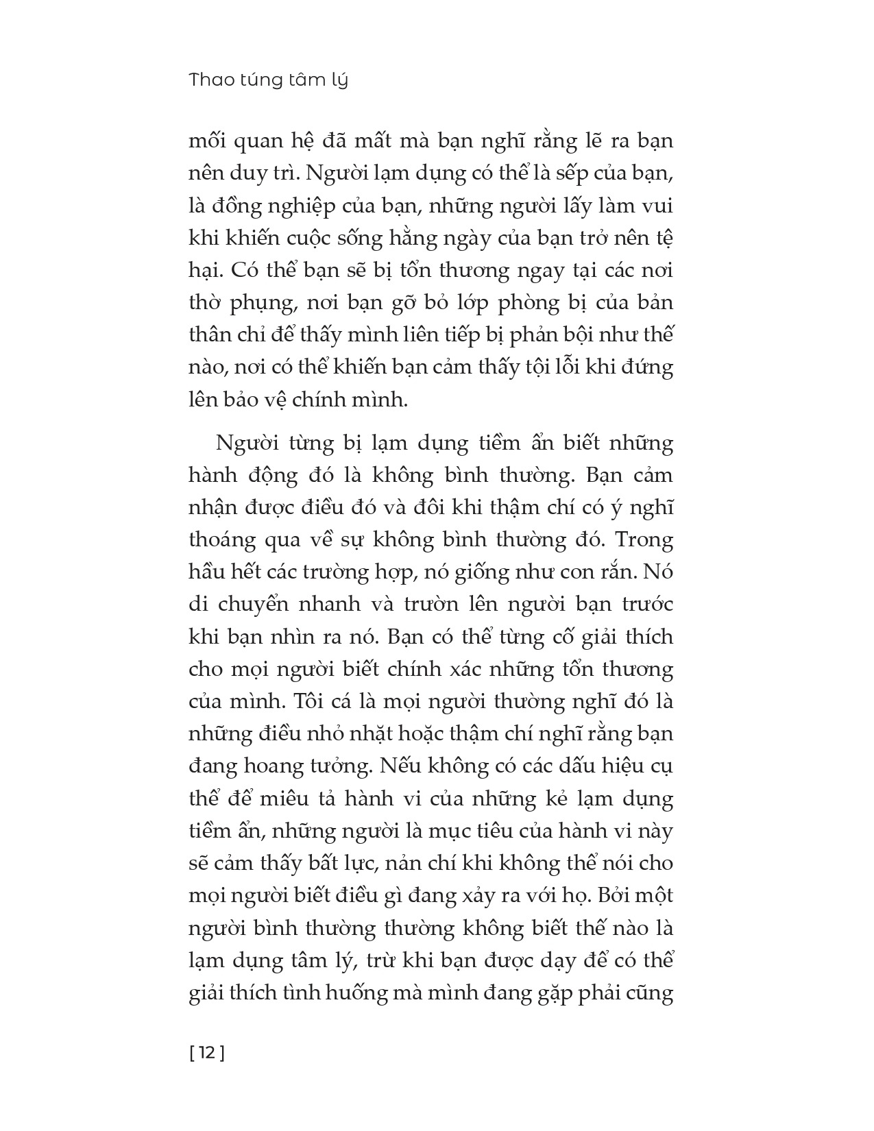 Shannon Thomas giải thích rằng thao túng tâm lý không dễ nhận ra; các nạn nhân thường cảm thấy bối rối, tự trách bản thân hoặc thậm chí nghi ngờ giá trị của chính mình. Những hành vi này được thực hiện tinh vi, có tính lặp đi lặp lại và thường được che giấu kỹ lưỡng, khiến người ngoài khó phát hiện. Cuốn sách cung cấp cái nhìn toàn diện về đặc điểm và các dạng lạm dụng tâm lý, đồng thời tập trung vào thao túng tâm lý, từ đó giúp độc giả nhận ra các dấu hiệu cảnh báo trong các mối quan hệ.