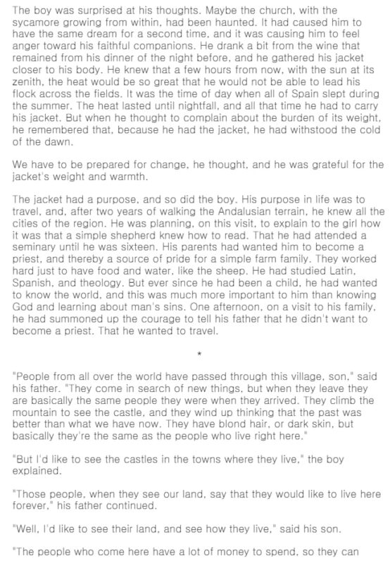 Santiago, nhân vật chính, ban đầu chỉ là một chàng trai bình thường với công việc chăn cừu, nhưng nhờ niềm tin vào giấc mơ, anh đã bước vào một hành trình đầy thử thách và khám phá. Trong quá trình này, Santiago học được cách lắng nghe trái tim, nhận biết dấu hiệu của vũ trụ, và quan trọng hơn cả, anh hiểu rằng những kho báu quý giá nhất không chỉ là vật chất mà còn là sự trưởng thành và trải nghiệm sống.