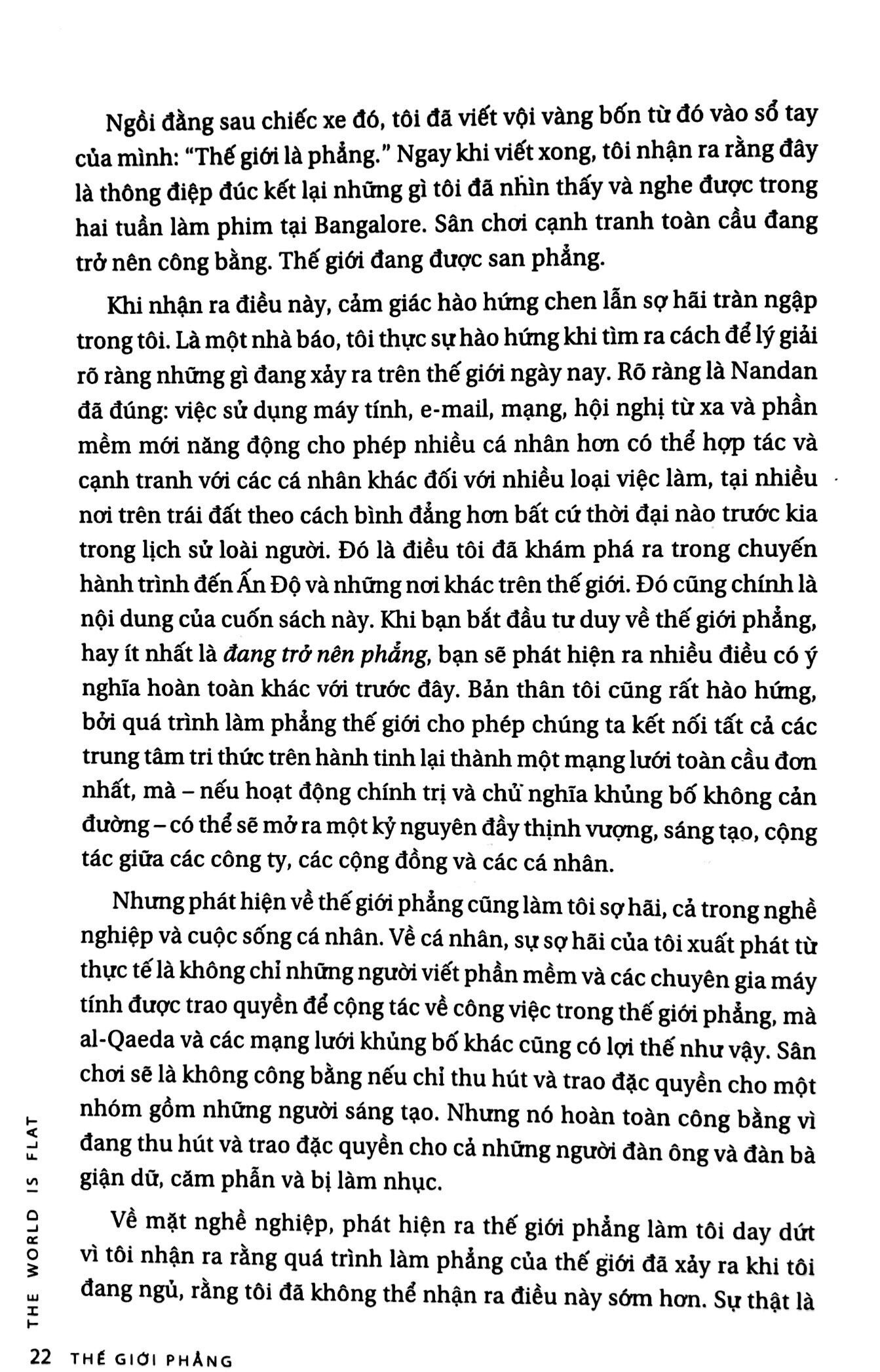 Nhờ vậy, cuốn sách không chỉ giúp độc giả phổ thông hiểu rõ hơn tiến trình toàn cầu hóa, mà còn cung cấp những kiến thức giá trị cho các nhà lãnh đạo, quản lý và doanh nhân để định hướng chiến lược trong tương lai. Với bản dịch được cập nhật kịp thời, nội dung mạch lạc và giữ trọn tinh thần nguyên tác, Thế Giới Phẳng thực sự là cuốn sách gối đầu giường cho bất kỳ ai muốn trang bị tư duy toàn cầu và sẵn sàng bước vào cuộc cạnh tranh quốc tế.