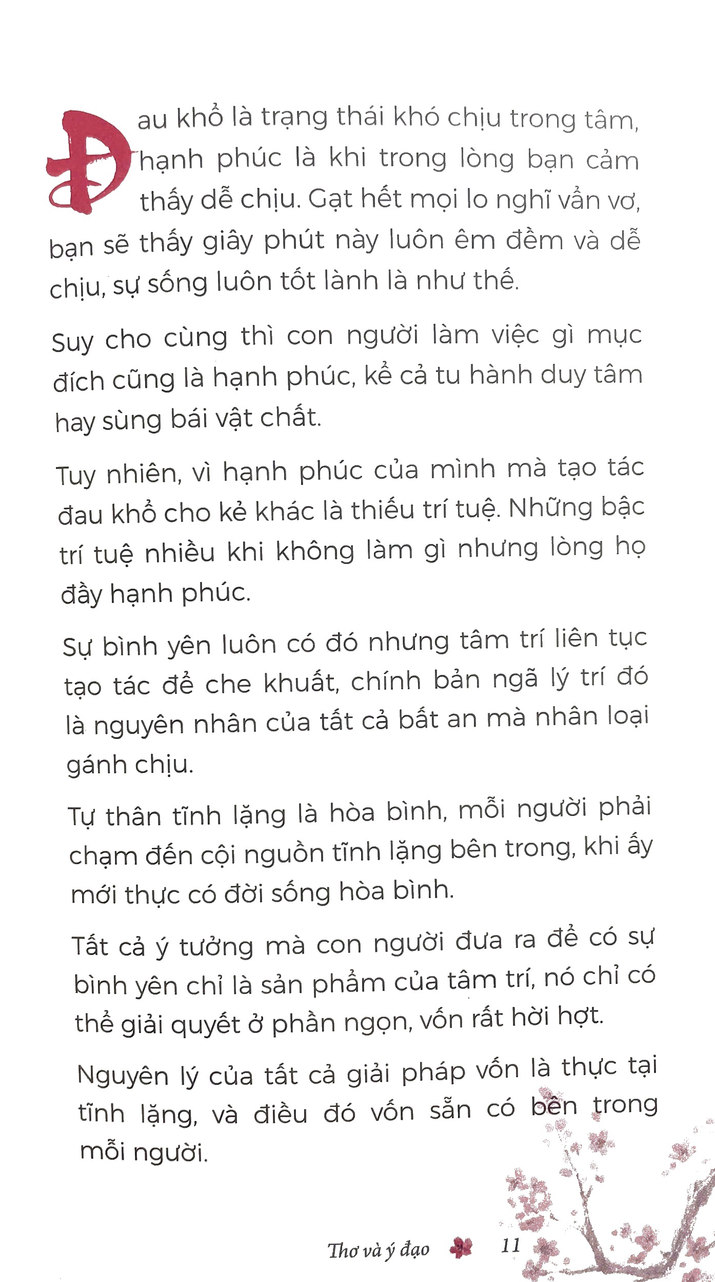 Thơ Và Ý Đạo là một tác phẩm đáng giá cho những ai muốn tìm về bình yên nội tâm và ý nghĩa thực sự của cuộc sống. Trong nhịp sống hiện đại đầy xô bồ, cuốn sách như một ánh sáng dẫn đường, giúp bạn tĩnh lặng, lắng nghe bản thân và nhận diện giá trị nội tại.