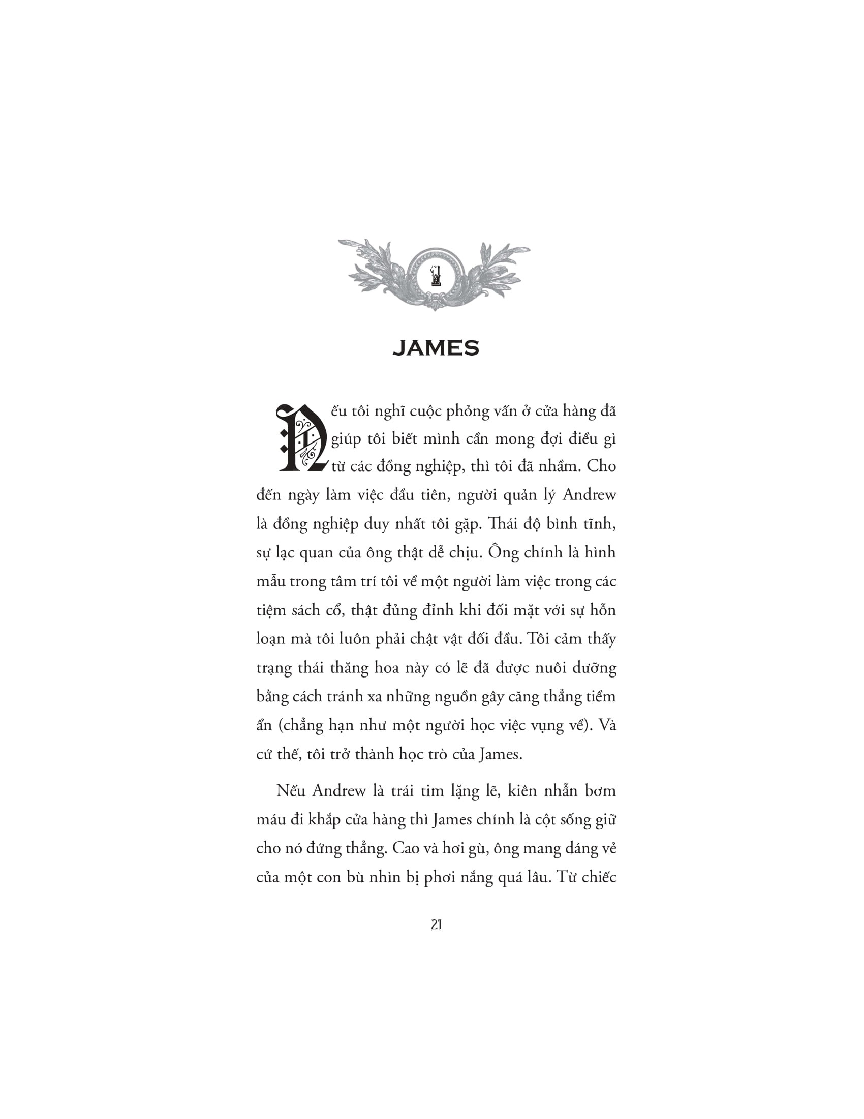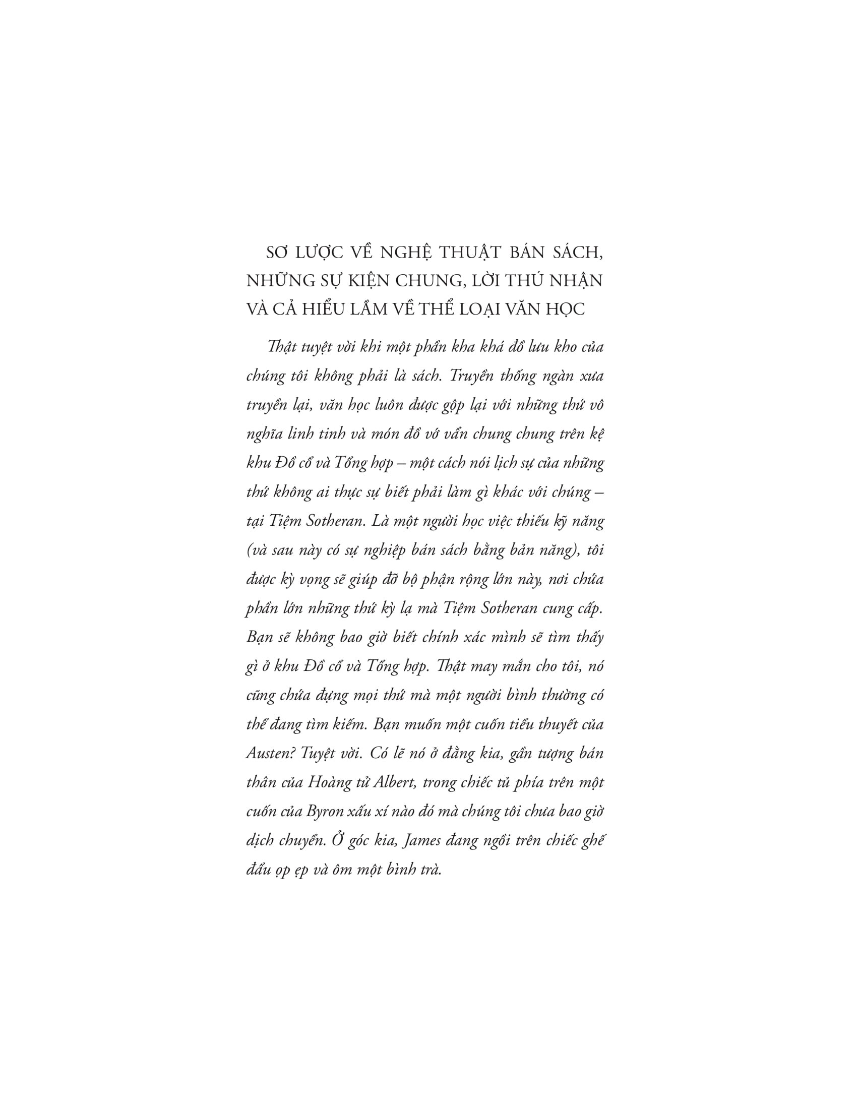 Đọc cuốn sách này, bạn không chỉ là độc giả, mà còn trở thành một phần của câu chuyện Oliver kể. Niềm đam mê, sự say mê và tâm huyết với văn hóa đọc được tác giả truyền tải trọn vẹn qua từng trang sách, khiến bạn như được sống trong không gian cổ kính, huyền bí và mê hoặc của tiệm sách trăm năm tuổi. Đây thực sự là một tác phẩm lôi cuốn, chạm đến trái tim của những ai trân quý giá trị vĩnh hằng của tri thức và ký ức nhân loại.