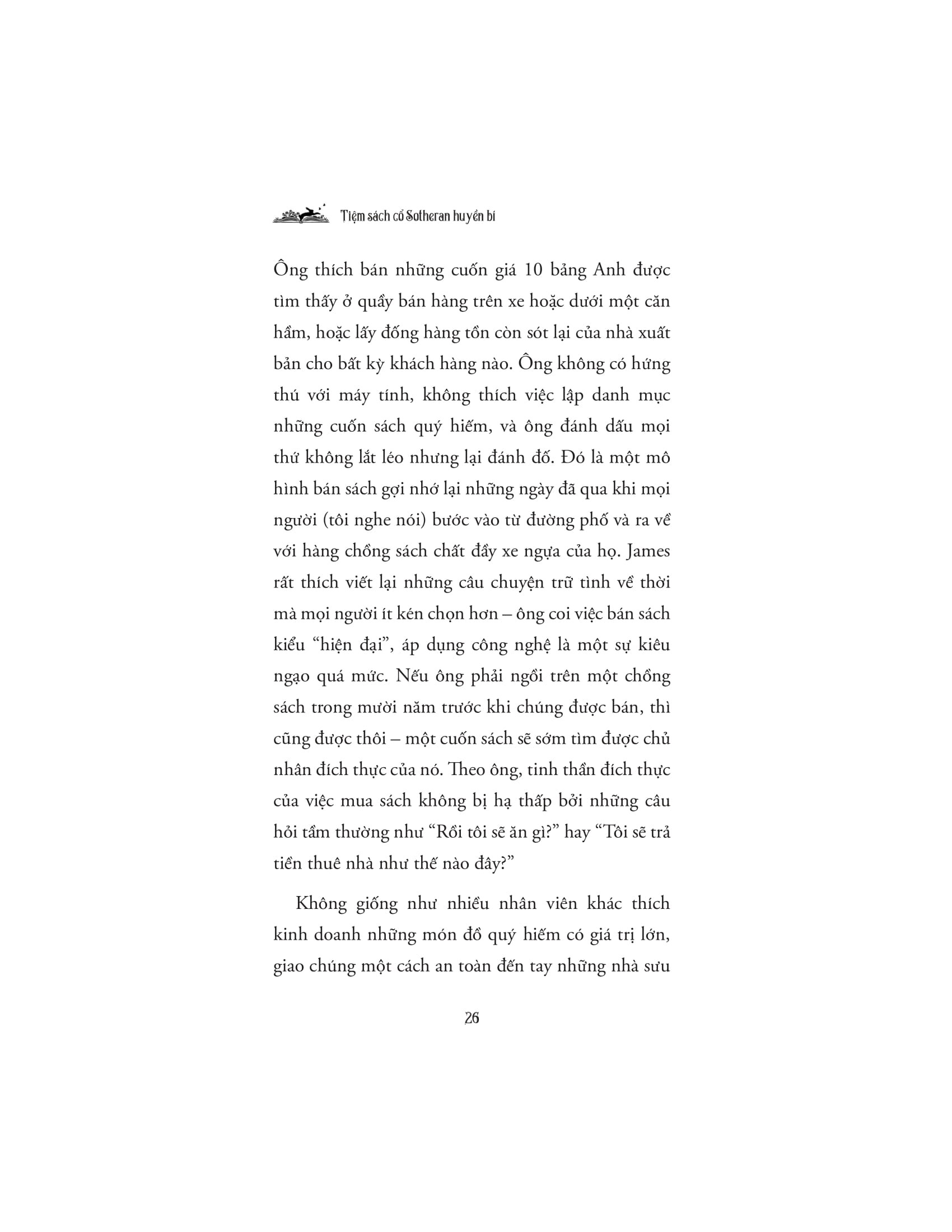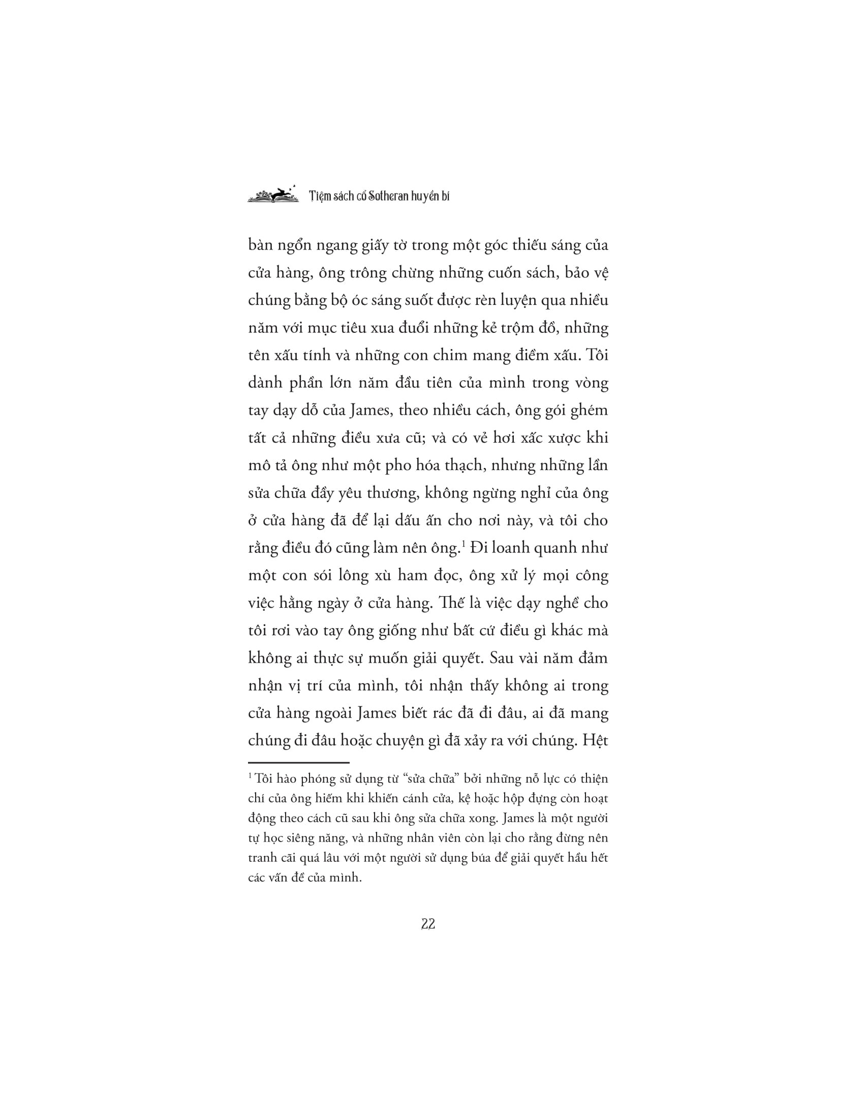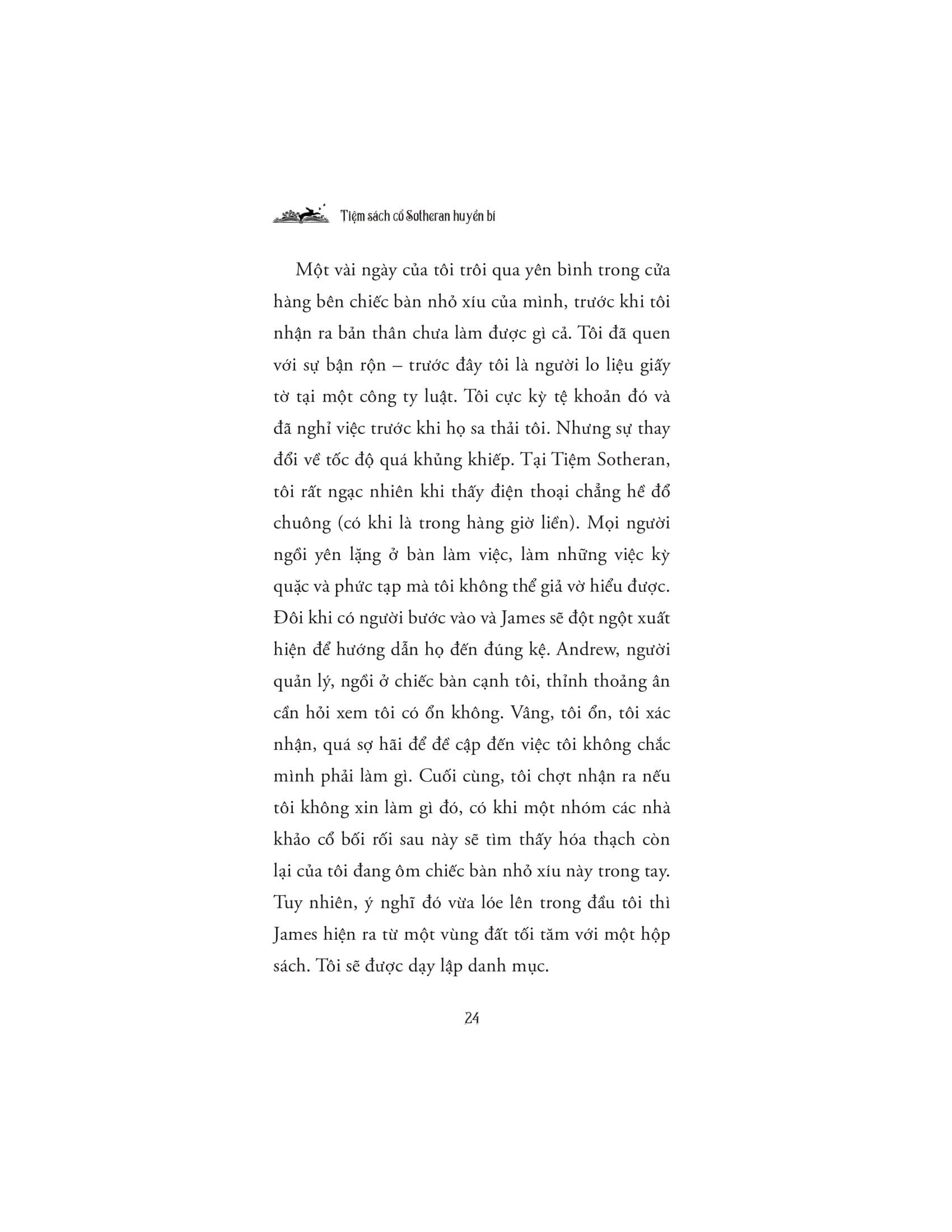 Ngay từ những trang đầu, Tiệm Sách Cổ Sotheran Huyền Bí đã mê hoặc người đọc bằng bầu không khí vừa cổ kính vừa huyền ảo. Oliver không chỉ kể chuyện, anh thổi hồn vào từng chi tiết, khiến tiệm sách như sống động trước mắt bạn. Ở đó, từng cuốn sách như thì thầm câu chuyện riêng, từng góc nhỏ đều ẩn giấu bí mật chờ được khám phá.