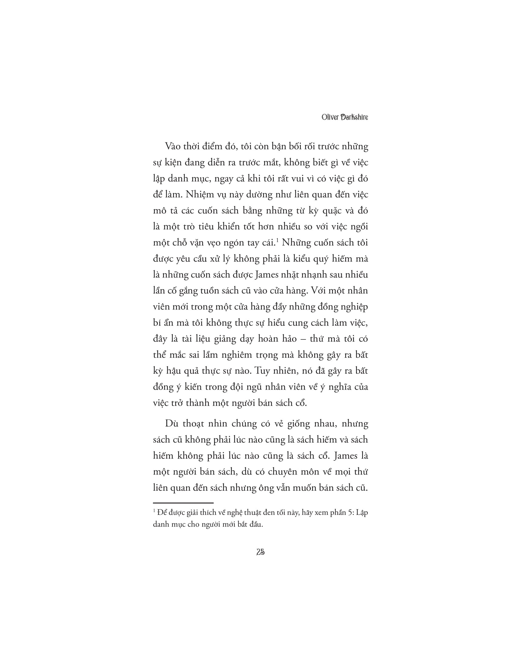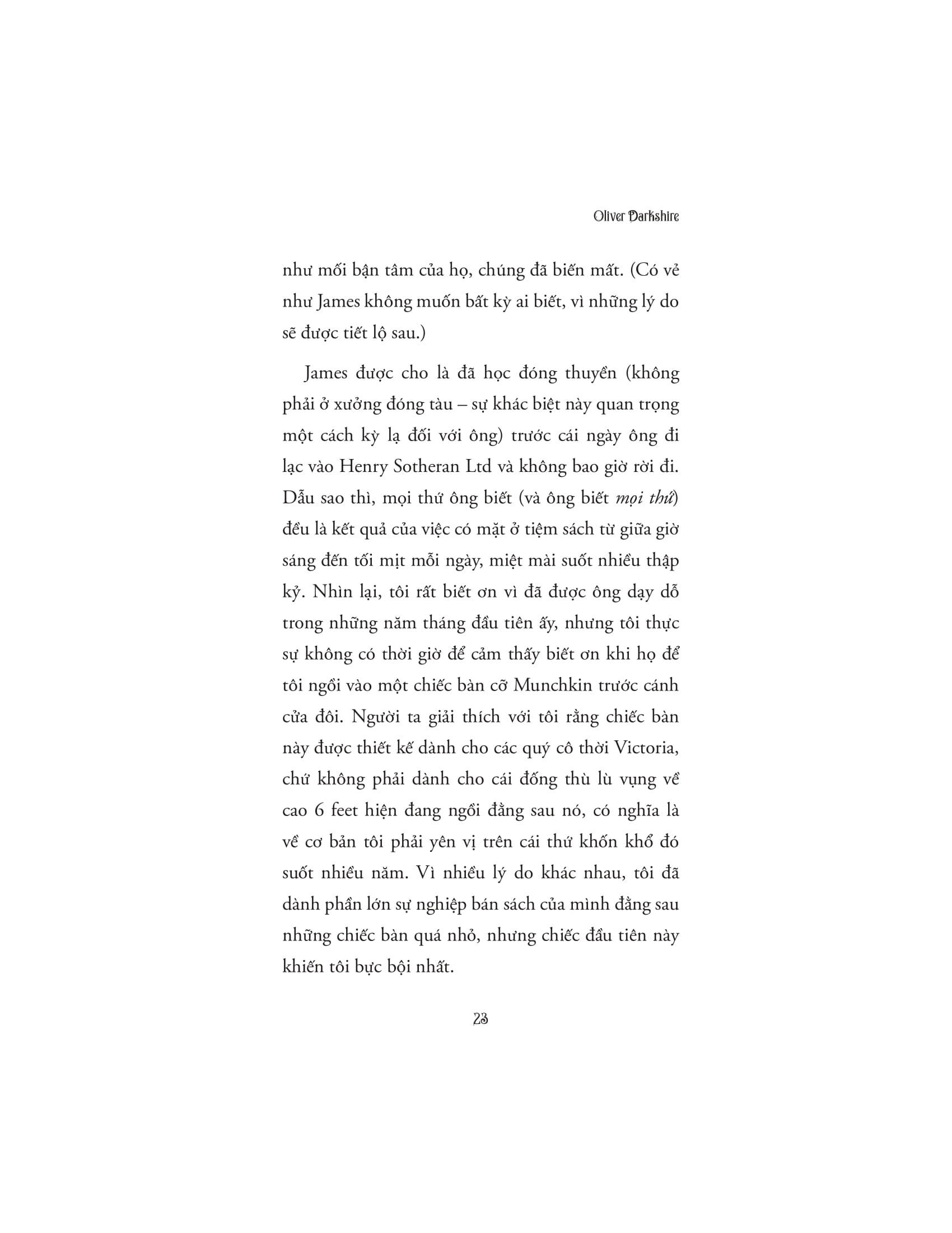 Oliver Darkshire từng loay hoay với nhiều công việc văn phòng trước khi số phận đưa anh đến với tiệm sách cổ Sotheran. Chính tại nơi này, anh tìm thấy niềm đam mê đích thực của mình với sách cũ và bắt đầu kể lại những câu chuyện kỳ lạ về tiệm sách, về khách hàng và về những kho báu tri thức bị lãng quên.