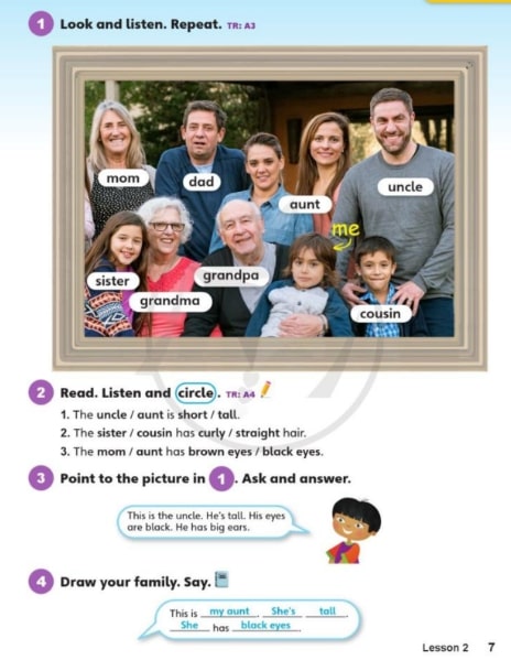 Chủ đề gia đình và bạn bè: Học sinh làm quen với từ vựng về các thành viên trong gia đình, bạn bè, hoạt động hàng ngày.