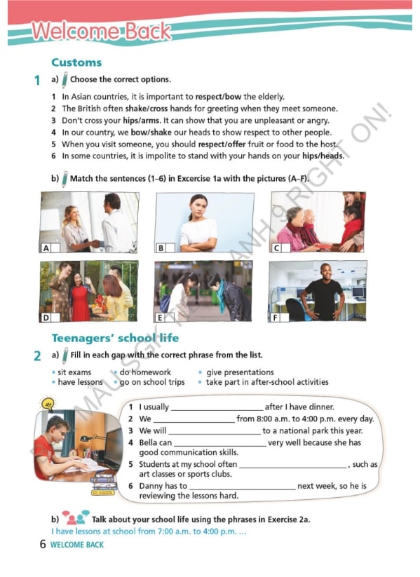 Tiếng Anh 9 Right on Student’s Book được chia thành các bài học theo chủ đề cụ thể, mỗi bài gồm: