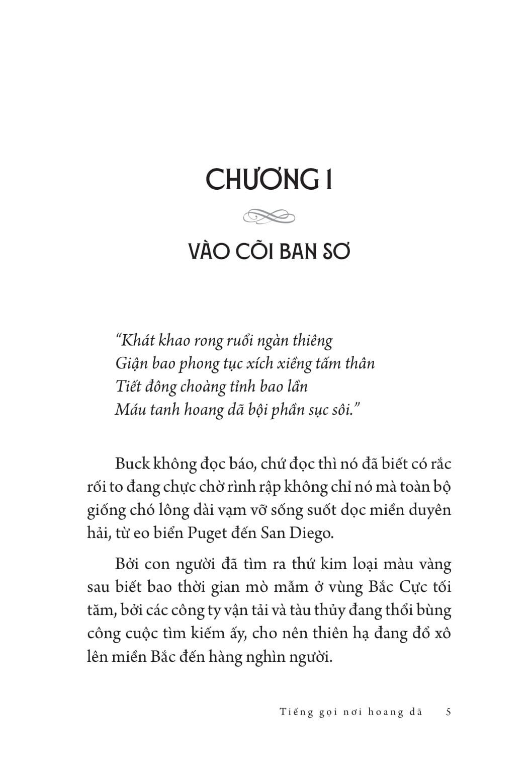 Trong dòng chảy câu chuyện, những thanh âm mơ hồ dần trở nên rõ rệt. Buck lắng nghe tiếng gọi đầy sức hút, một tiếng gọi đa thanh, vừa thôi thúc vừa quyến rũ, dẫn nó đến thế giới mới. Ở miền Alaska lạnh lẽo, nơi đoàn người và những đàn chó kéo xe hối hả lao vào cơn sốt vàng, tình thương và khát vọng sinh tồn trở thành ánh sáng dẫn dắt hành trình của Buck.
