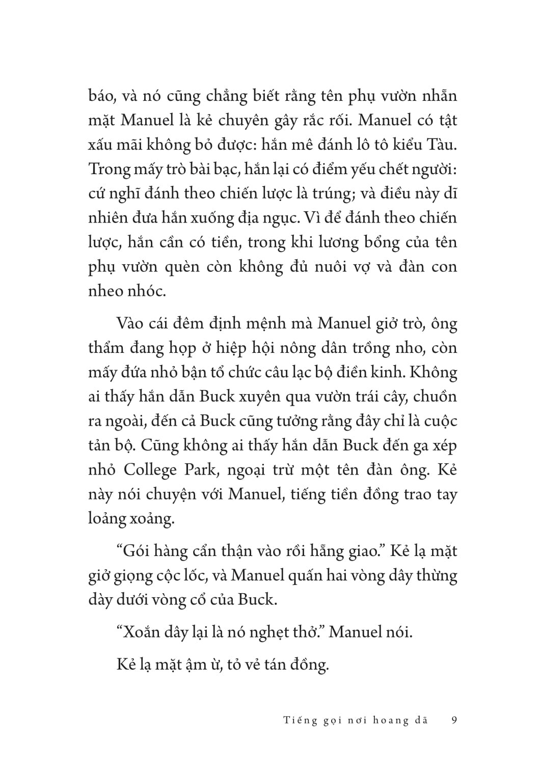 Tiếng Gọi Nơi Hoang Dã là tác phẩm đầy cảm xúc, ghi dấu ấn sâu đậm trong lòng người đọc. Hành trình của Buck không chỉ là cuộc đấu tranh sinh tồn nơi băng tuyết, mà còn là sự khơi dậy bản năng hoang dã tiềm ẩn. Những trang sách đưa bạn đến cảm giác hồi hộp, nghẹt thở nhưng cũng đầy suy ngẫm về tự do và lòng trung thành.