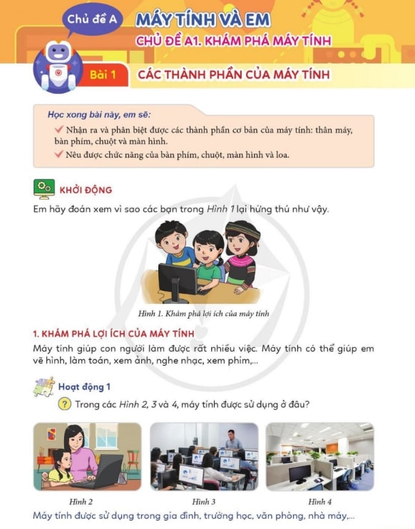 Bài học đầu tiên trong Tin học lớp 3 Cánh Diều Bài 1 hướng dẫn học sinh cách nhận biết các thành phần cơ bản của máy tính như màn hình, bàn phím, chuột và loa. Qua các hoạt động thực hành, học sinh học được cách bật/tắt máy tính, mở chương trình phần mềm cơ bản và thao tác lưu trữ dữ liệu. Ngoài ra, bài học còn khuyến khích trẻ rèn luyện thói quen sắp xếp màn hình gọn gàng và bảo vệ thiết bị, tạo nền tảng tốt cho các bài học tiếp theo.