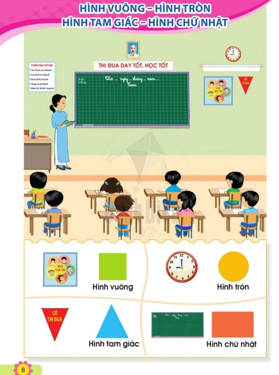 Nhận biết hình tròn, hình vuông, hình tam giác, hình chữ nhật qua các vật thể xung quanh. Phần này luôn được trẻ yêu thích nhờ tính trực quan, dễ hiểu.
