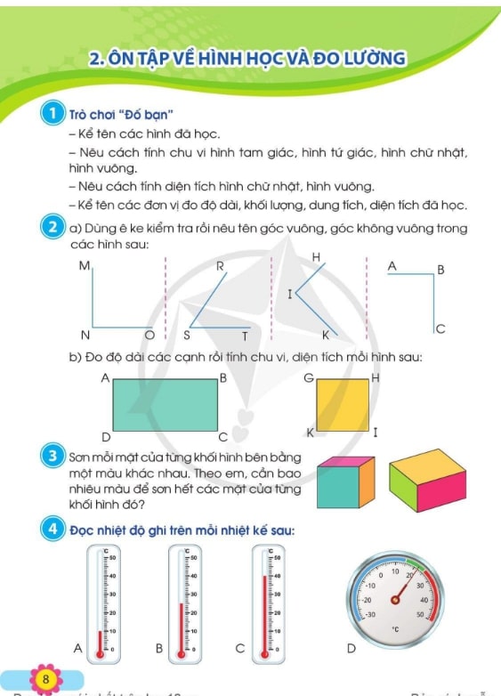 Hình học và đo lường: Bộ sách giới thiệu các hình học cơ bản như hình vuông, hình chữ nhật, hình tam giác, hình tròn, cùng các kiến thức về diện tích, chu vi và các đơn vị đo lường. Bài tập thực hành giúp học sinh hiểu rõ mối quan hệ giữa các đối tượng hình học, đồng thời phát triển khả năng tưởng tượng không gian.