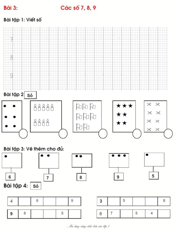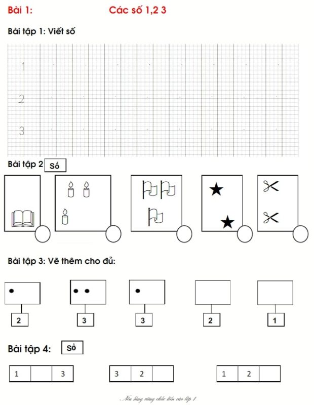 Các phiếu bài tập giúp bé củng cố lại kiến thức đã học. Mỗi phiếu thường chứa từ 5–10 bài tập nhỏ như đếm số, so sánh, điền số còn thiếu hoặc chọn hình đúng. Phụ huynh có thể in ra để bé luyện tập hàng ngày.