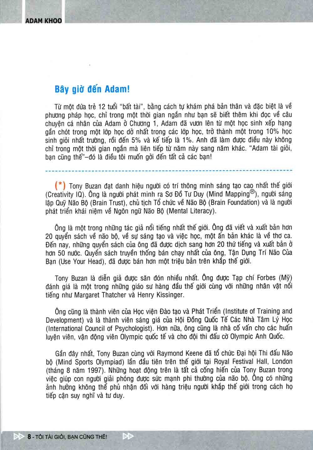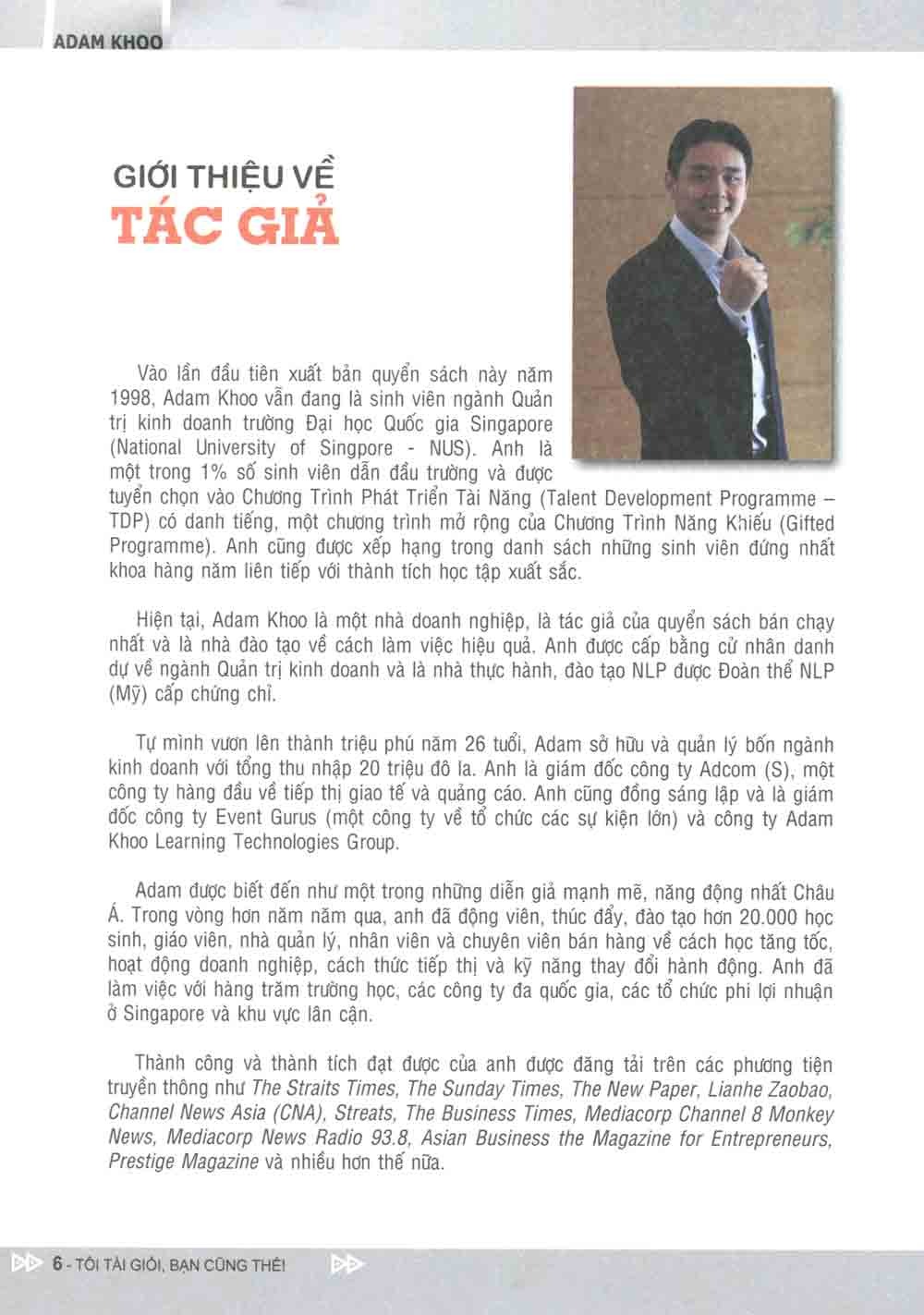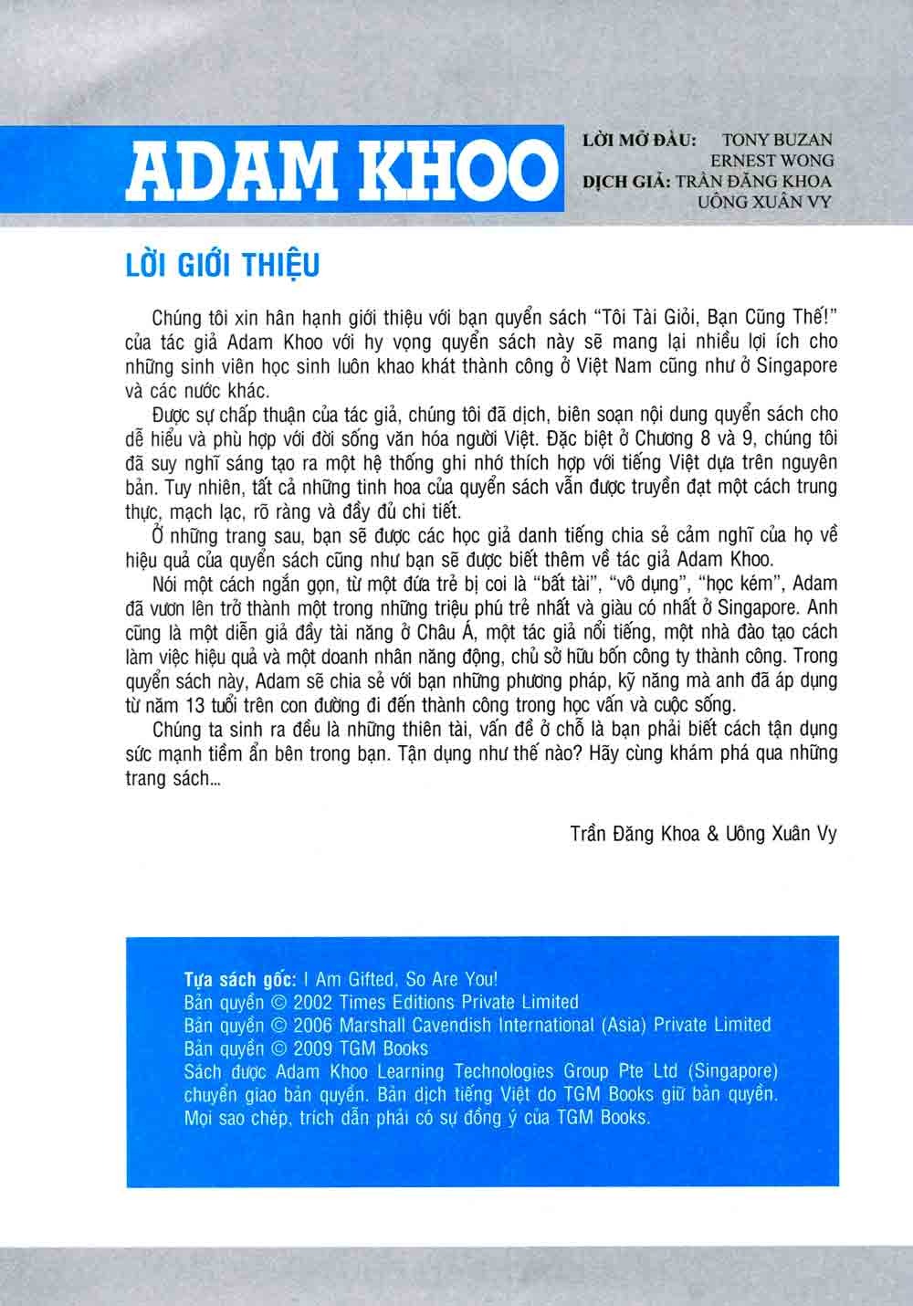Tôi Tài Giỏi, Bạn Cũng Thế (I’m Gifted, So Are You) là cuốn sách truyền cảm hứng nổi tiếng của Adam Khoo, một trong những doanh nhân – diễn giả hàng đầu Singapore. Tác phẩm được xuất bản lần đầu vào năm 2002 và nhanh chóng trở thành “kim chỉ nam” cho hàng triệu học sinh, sinh viên, cũng như những người trẻ đang tìm kiếm phương pháp học tập hiệu quả và khát khao khẳng định bản thân.