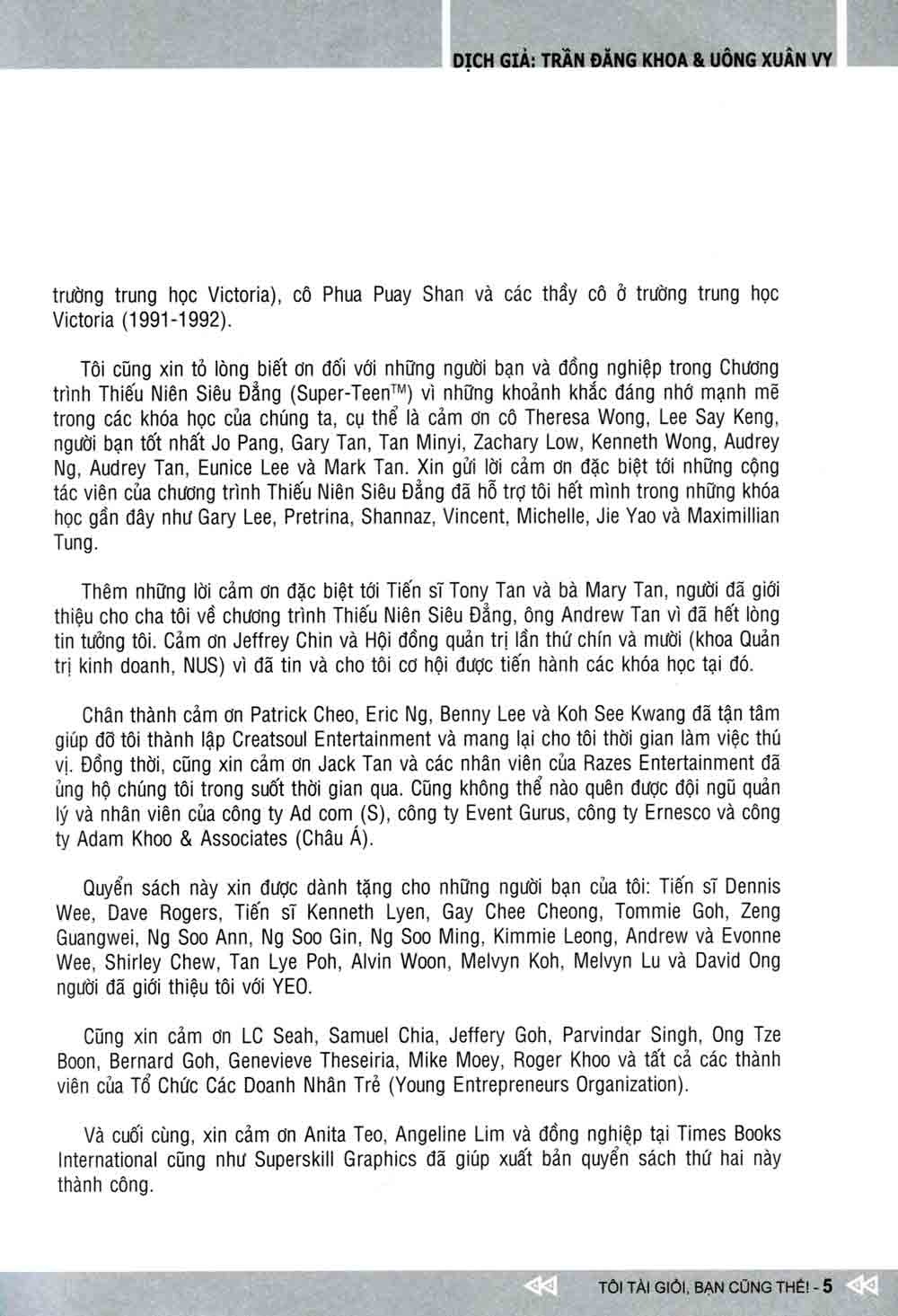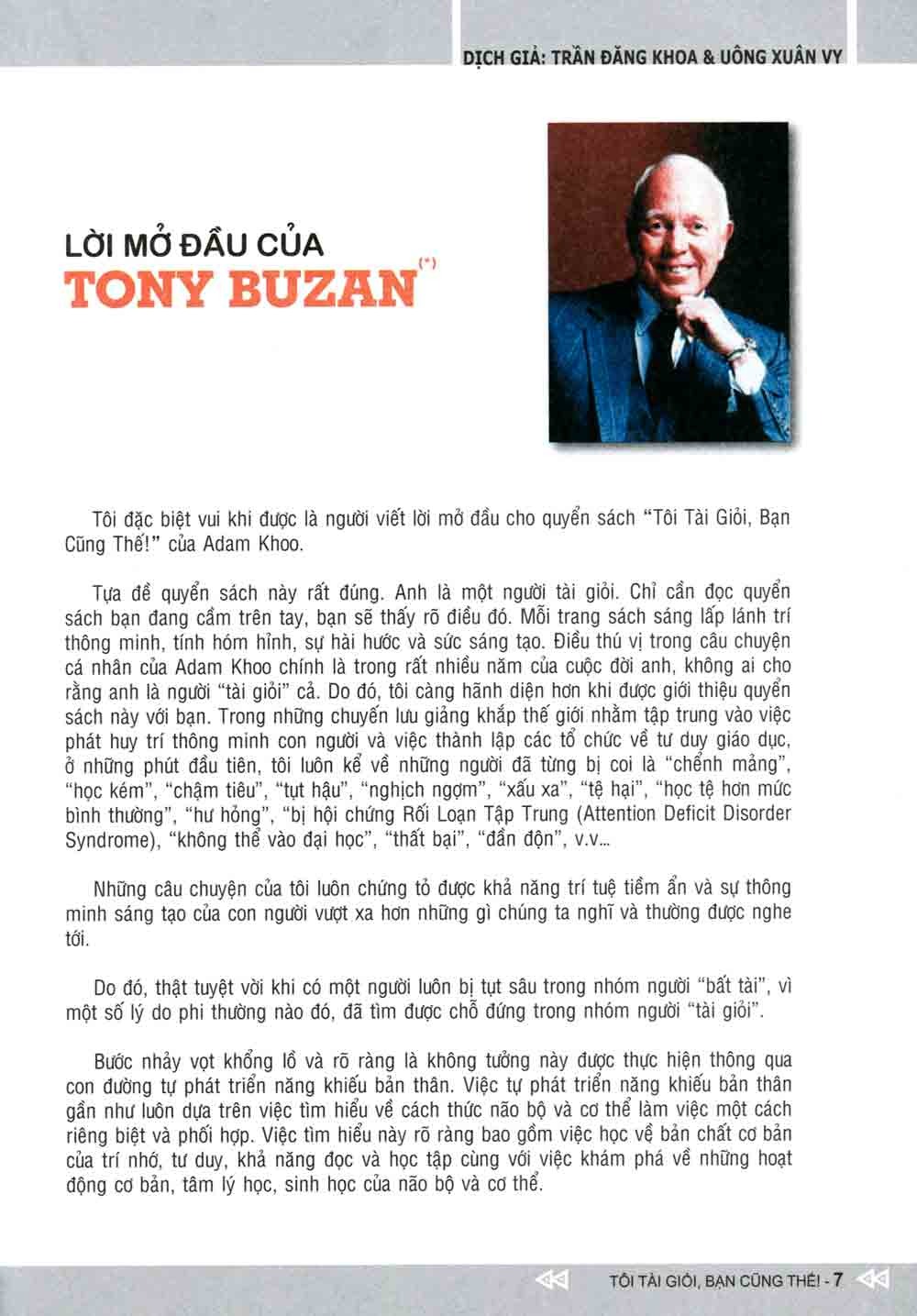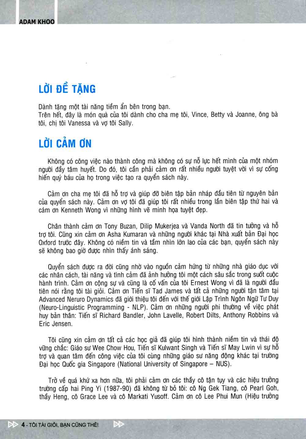 Tôi Tài Giỏi, Bạn Cũng Thế (I’m Gifted, So Are You) là cuốn sách truyền cảm hứng nổi tiếng của Adam Khoo, một trong những doanh nhân – diễn giả hàng đầu Singapore. Tác phẩm được xuất bản lần đầu vào năm 2002 và nhanh chóng trở thành “kim chỉ nam” cho hàng triệu học sinh, sinh viên, cũng như những người trẻ đang tìm kiếm phương pháp học tập hiệu quả và khát khao khẳng định bản thân.
