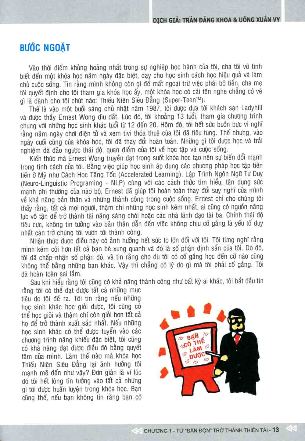 Cuốn sách không chỉ dừng lại ở học tập, mà còn khuyến khích bạn đọc khám phá tư duy thành công. Adam Khoo kể lại chính hành trình của bản thân: từ một cậu bé bị xếp hạng kém trong lớp, bị coi thường, nhưng nhờ thay đổi tư duy và áp dụng phương pháp đúng, ông đã trở thành sinh viên xuất sắc và sau đó là triệu phú ở tuổi 26.