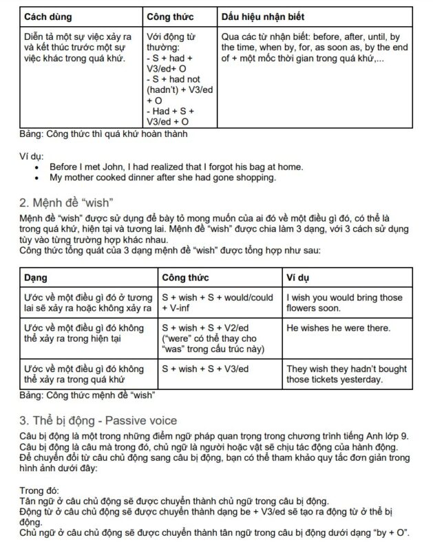 Ngữ pháp trong chương trình lớp 9 tập trung vào khả năng sử dụng linh hoạt hơn là học thuộc công thức. Các thì cơ bản như hiện tại hoàn thành, quá khứ đơn, quá khứ tiếp diễn và tương lai đơn vẫn giữ vai trò chủ đạo, nhưng yêu cầu phân biệt ngữ cảnh sử dụng chính xác. Bên cạnh đó, câu bị động, câu tường thuật, mệnh đề quan hệ và câu điều kiện là những nội dung xuất hiện thường xuyên trong đề kiểm tra.