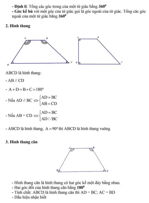 Song song với đại số, phần hình học lớp 8 đóng vai trò rèn luyện tư duy suy luận và khả năng trình bày logic. Nội dung mở đầu xoay quanh tứ giác và các dạng đặc biệt như hình thang, hình bình hành, hình chữ nhật, hình thoi hay hình vuông. Học sinh cần ghi nhớ dấu hiệu nhận biết, tính chất cạnh – góc – đường chéo để vận dụng trong các bài chứng minh song song hoặc bằng nhau. Khi nắm chắc phần này, việc giải các bài toán hình học phức tạp sẽ trở nên có định hướng rõ ràng hơn.