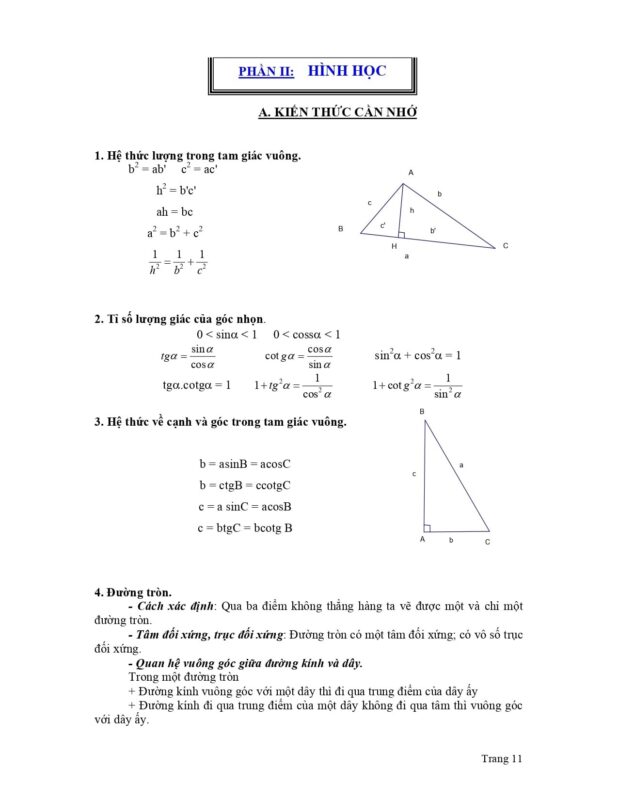 Ở hình học học kỳ I, hệ thức lượng trong tam giác vuông đóng vai trò cốt lõi. Các công thức liên quan đến sin, cos, tan, cot cùng định lý Pitago mở rộng là chìa khóa để giải nhanh nhiều bài toán thực tế. Do đó, khi ôn tập tổng hợp kiến thức Toán 9 kì 1, học sinh nên kết hợp ghi nhớ công thức với luyện tập bài tập theo từng dạng để tránh nhầm lẫn.
