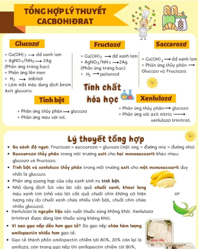 Cacbohiđrat là nhóm chất quan trọng, bao gồm glucozơ, saccarozơ, tinh bột và xenlulozơ. Nội dung lý thuyết không chỉ dừng lại ở cấu tạo phân tử mà còn mở rộng sang các phản ứng đặc trưng như phản ứng tráng bạc, phản ứng lên men và phản ứng thủy phân. Học sinh cần phân biệt rõ từng chất thông qua tính chất hóa học và ứng dụng thực tế.