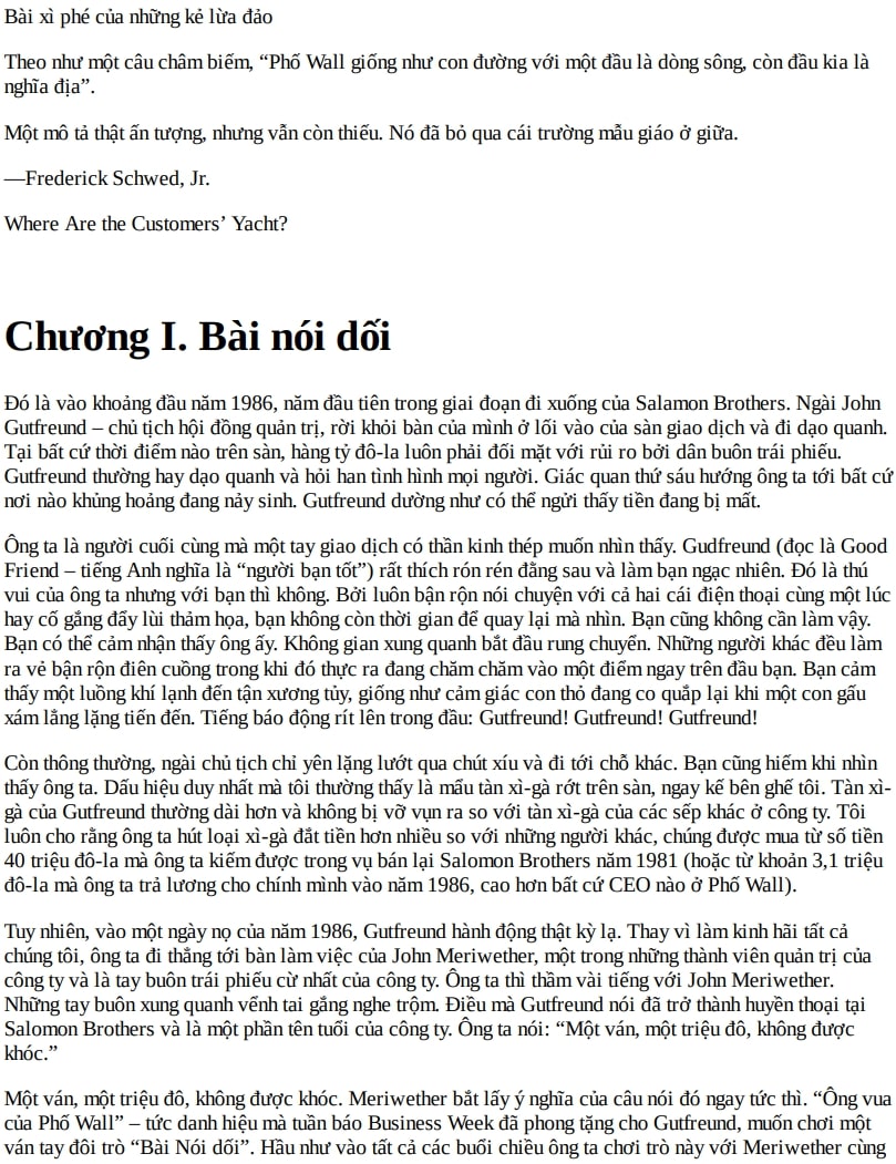 Michael Lewis mở đầu cuốn sách bằng cách dẫn dắt người đọc vào một thế giới nơi các khoản tiền triệu đô la được giao dịch mỗi ngày. Tại Salomon Brothers, áp lực và cạnh tranh khốc liệt là điều bình thường, và những nhân viên trẻ như Lewis phải học cách sinh tồn giữa những đồng nghiệp sắc sảo và đôi khi… sẵn sàng bluff để chiến thắng.