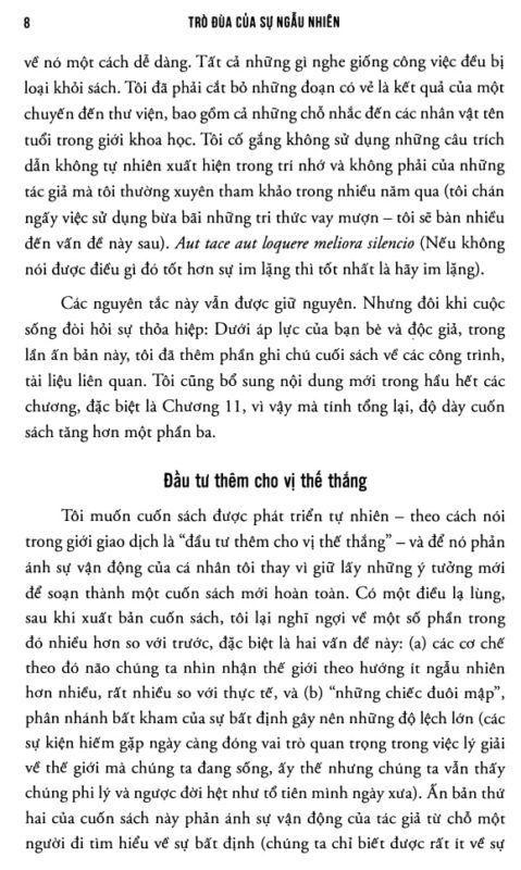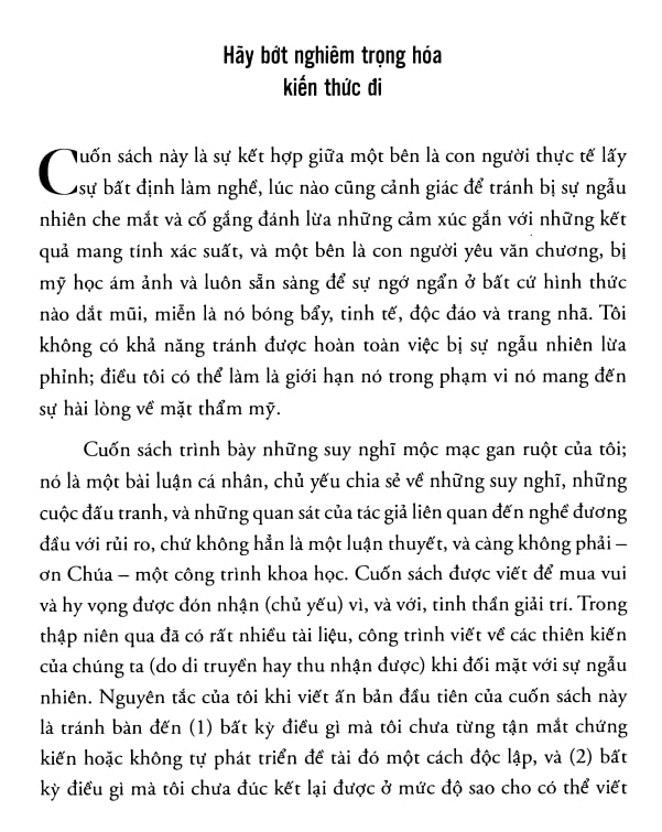 Với lối viết thông minh, hài hước và trực diện, Taleb hướng dẫn cách tư duy khác biệt, tránh những bẫy tâm lý và nhìn nhận thế giới với đôi mắt tỉnh táo hơn. Đây không chỉ là một tác phẩm về xác suất hay rủi ro, mà còn là kim chỉ nam cho những ai muốn hiểu sâu về cách vận hành của cuộc sống, nắm bắt cơ hội và sống thông minh trong một thế giới đầy bất ngờ.