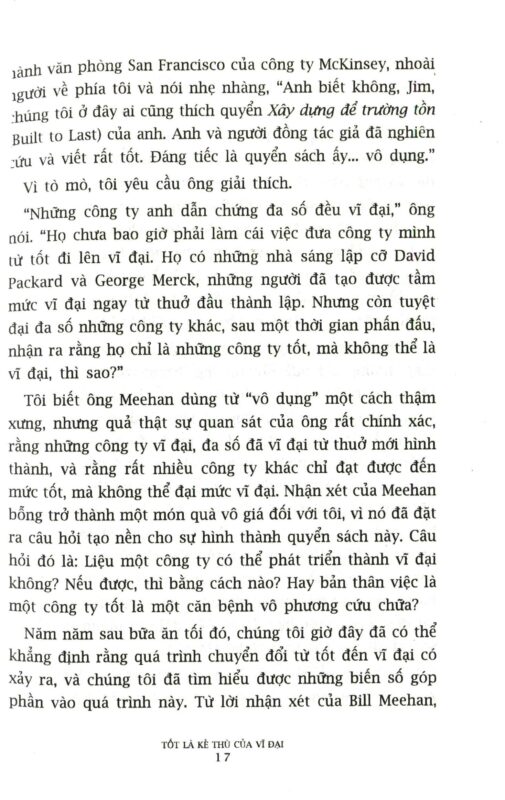 Từ Tốt Đến Vĩ Đại của Jim Collins là công trình nghiên cứu quản trị nổi bật, phân tích hành trình chuyển mình của các doanh nghiệp từ mức “ổn định” sang vị thế dẫn đầu thị trường. Dựa trên dữ liệu thực chứng trong nhiều năm, tác giả bóc tách những yếu tố then chốt như mô hình Lãnh đạo cấp độ 5, tư duy Con Nhím và văn hóa kỷ luật làm nền tảng tăng trưởng bền vững. Cuốn sách không chỉ kể câu chuyện thành công mà còn lý giải cơ chế tạo nên bước nhảy vọt chiến lược. Lập luận chặt chẽ, dẫn chứng thuyết phục và góc nhìn sâu sắc giúp người đọc tái định hình cách xây dựng tổ chức xuất sắc. Đây là tài liệu giá trị cho nhà quản lý, doanh nhân và những ai mong muốn kiến tạo thành tựu vượt chuẩn thông thường.