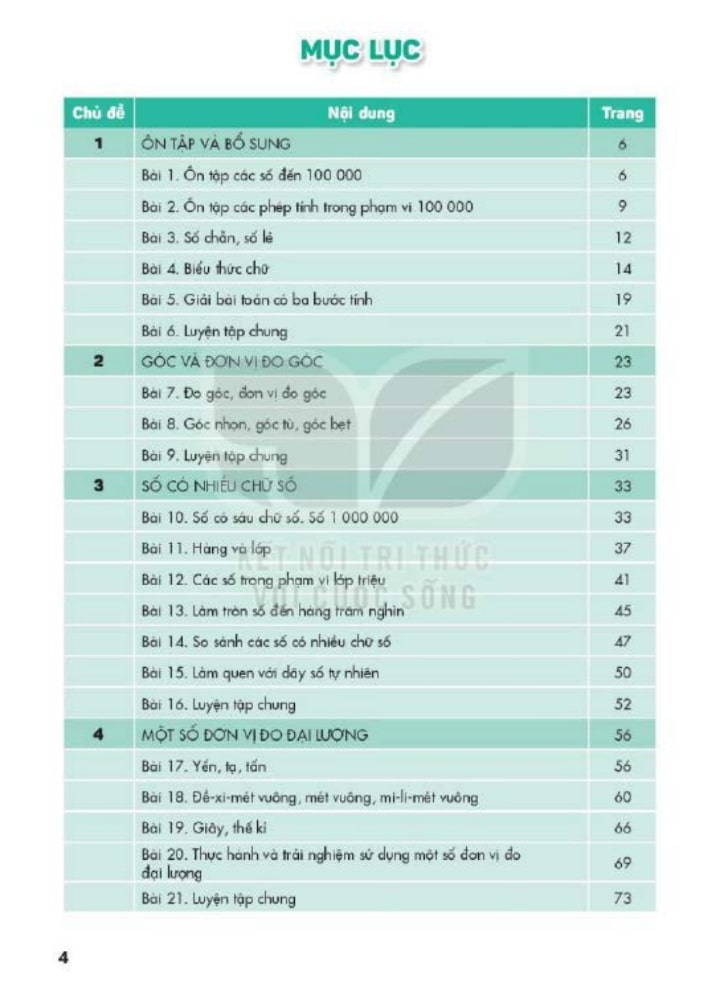 Sự phân bổ hợp lý này giúp học sinh không bị quá tải, đồng thời rèn luyện kỹ năng toán học từng bước vững chắc. Cả hai tập đều có thể tải bản PDF chính thống của Sách Toán lớp 4 Kết nối tri thức, rất tiện lợi cho việc học online hoặc in ra để ôn tập.